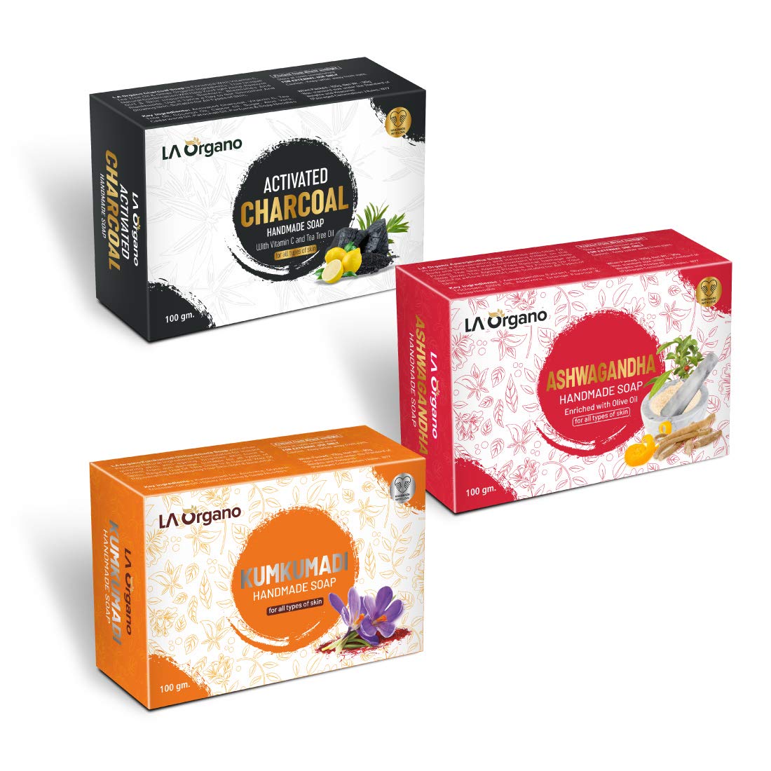 LA Organo Handmade Charcoal Ashwagandha & Kumkumadi Bath Soap (100g each Pack Of 3)