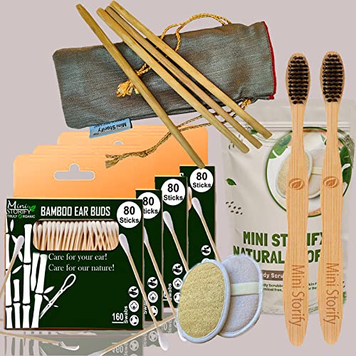 Mini Storify Truly Organic 4.Bamboo Cotton ear bud2.Adult bamboo toothbrush ,2 Oval Loofah/Loufah Pads, Sponge 4.Bamboo Straw (8 inch) (PACK OF 12)