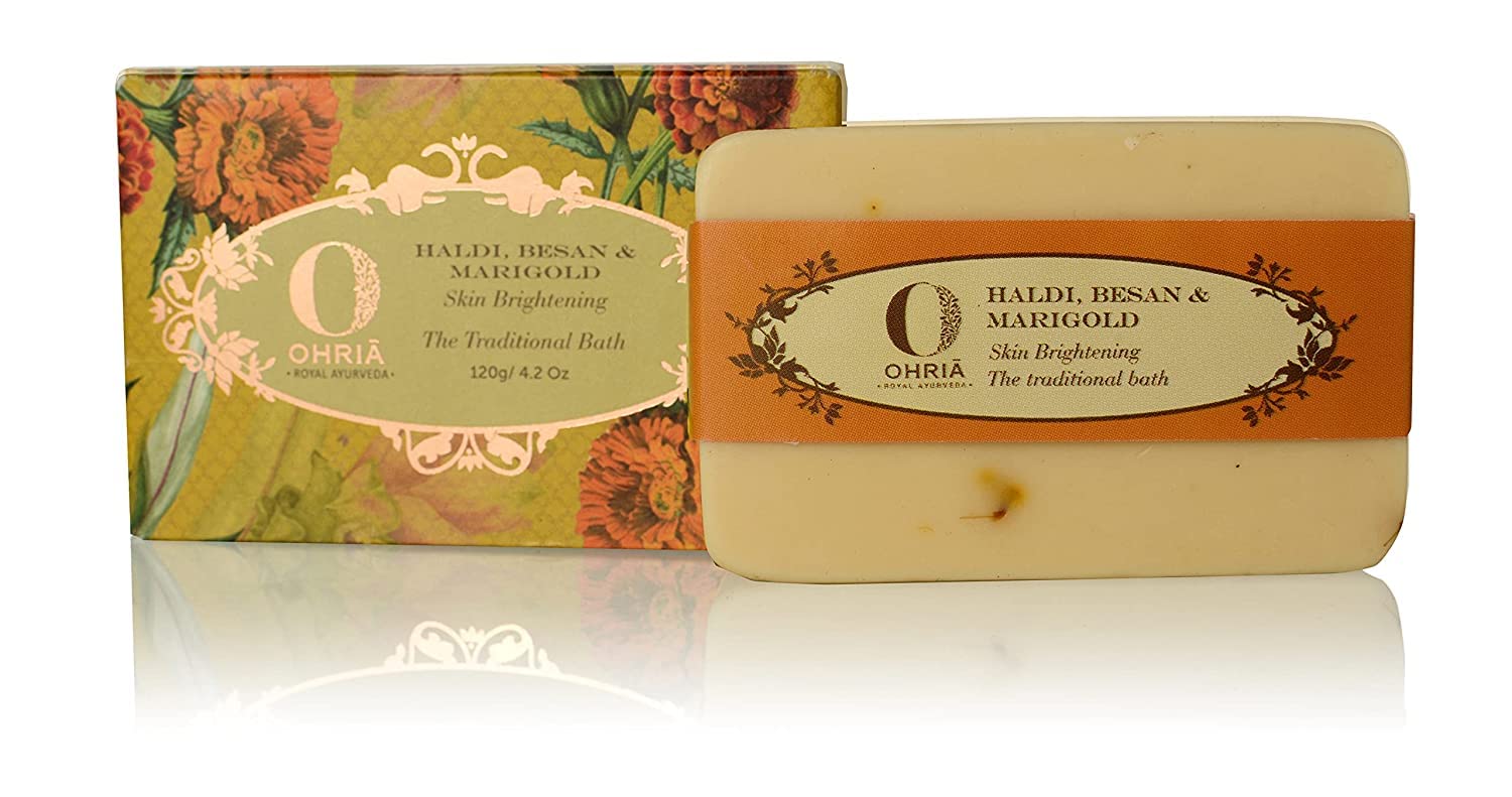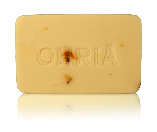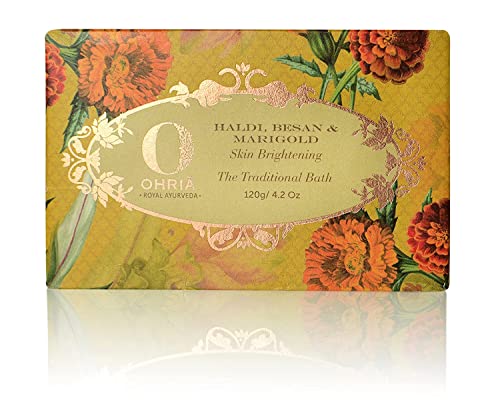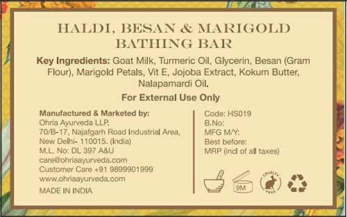Fresh Handmade skin brightening bathing bar with natural cleansing & nourishing agents Besan (Gram flour) Lentils Turmeric and Goat Milk traditionally used for bathing by royals. All these are blended after slow heat infusion keeping all nutrients intact for softening and skin brightening Kokum butter Turmeric essential oil Triphala and sandalwood oil softens and helps depigment.
