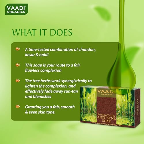 With a high concentration of antimicrobial agent terpinenol tea tree oil makes this soap extremely effective against acne. It rids the surface of dirt germs and excess sebum. It even unclogs pores and relieves skin congestion granting you freedom from acne worries. What causes Acne? These are a few causes which lead to Acne which further ends up in scarring and blemishes. Everyday beauty products like sunscreen make up items creams and even excessive exfoliation can lead to Acne breakout or zits. Oil gets trapped in pores and the skin cannot breathe which causes skin irritation and pimples. External factors such as air-pollution exposure of skin in excessive sunlight for a long period of time. What should be the first step towards getting a flawless skin? There are a number of factors which causes skin problems and to battle them all natural ingredients like Tea Tree Oil Lemon Extracts turmeric and clove will prove to be the best combination. Generally the soaps available in the market can be harsh to your skin and take away all essential skin oils and in severe conditions accelerate irritation and Acne. Tea Tree Oil and the Skin Probably one of the most useful oil available Tea Tree Oil is an excellent germ killer with antiseptic and antibacterial properties. Tea Tree Oil is a leaf-extract of Melaleuca Alternifolia which is found in the northeast coast of Australia towards New South Wales. Tea Tree Oil proves to be unfailingly useful for the following: Moisturizing and Cleansing: Tea Tree Oil moisturizes and cleanses the skin. It helps in opening up the clogged pores. This oil is also beneficial in a a way that it removes the dead cells accumulated on the surface of the skin without damaging the skin. The skin is left supple flawless and tempting to touch. Toning: Tea tree Oil is a natural skin toner as it gently removes the blemishes and fine wrinkles and takes you a step ahead in skin care. Removing excess oil and Preventing Blemishes: This oil is mild but strong enough to reduce the production of sebum which leads to bacterial activity on the skin thereby leading to pimples and furthermore blemishes and scars. Clove Oil and the Skin Extracted from Syzygium aromaticum which is found in Indonesia's Maluku Islands Clove Oil's anti-bacterial property helps in keeping off the microbial activity from the skin surface thus helping in preventing acne and pimples. Clove oil kills the bacteria that starts to feed on the sebum generated thereby reducing all possible chances of spreading of acne by nipping it in the bud. Also Clove oil is a natural exfoliant that clears off the dead skin and excess oil to make way for a healthier clearer and glowing skin. With Clove Oil the skin breathes as the pores are unclogged and bacteria-free. Turmeric and the Skin One of the most commonly found herbs in India Turmeric has more to it than what meets the eye. Apart from adding flavor to the food Turmeric possesses every possible solution to yield a beautiful sun-kissed skin. Benefits of turmeric: Reduces Skin Pigmentation Turmeric reduces the skin pigmentation thereby yielding a fresh beautiful and clear skin. Cleanses the skin inside out and gives a radiant natural glow. Anti-Bacterial & Antiseptic Properties Turmeric prevents and fights breakouts & Pimples. Reduces inflammations breakouts and balances skin discolorations and patches. Good for Oily Skin Turmeric regulates the production of sebum which is produced in the sebaceous glands of the skin. This helps in deep pore cleansing leading to a fairer flawless skin. Citrus Extract and the Skin Vitamin C is a natural bleach. It helps in the detoxification cleansing and maintaining the balance of the skin. Citrus Extracts are a rich source of Vitamin C. Damaged tanned and pigmented skin is lightened and cleansed deep giving way to a healthier softer skin with no patches blemishes or scars. Citrus Extracts basically help in the rejuvenation and renewal imparting a natural glow to the skin.