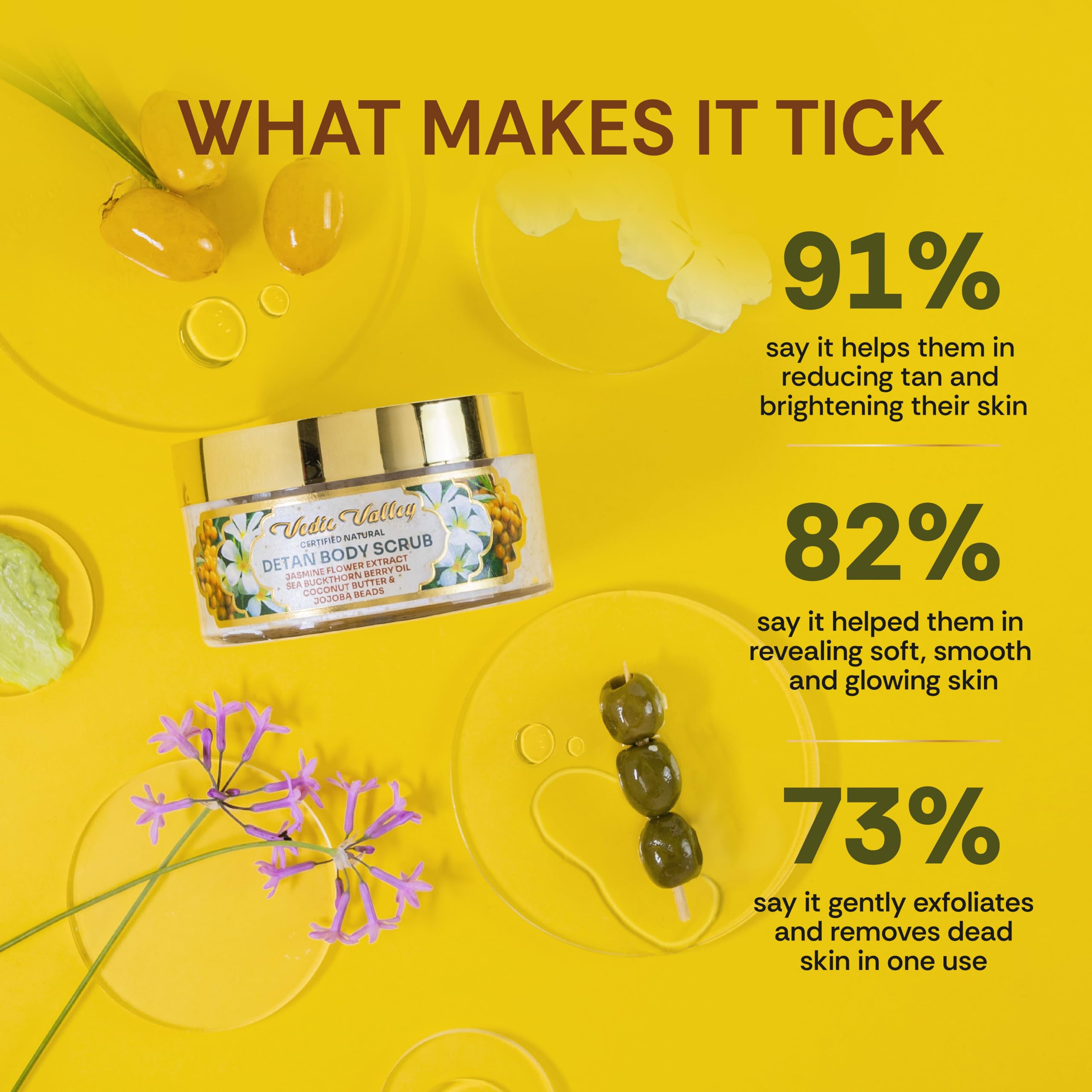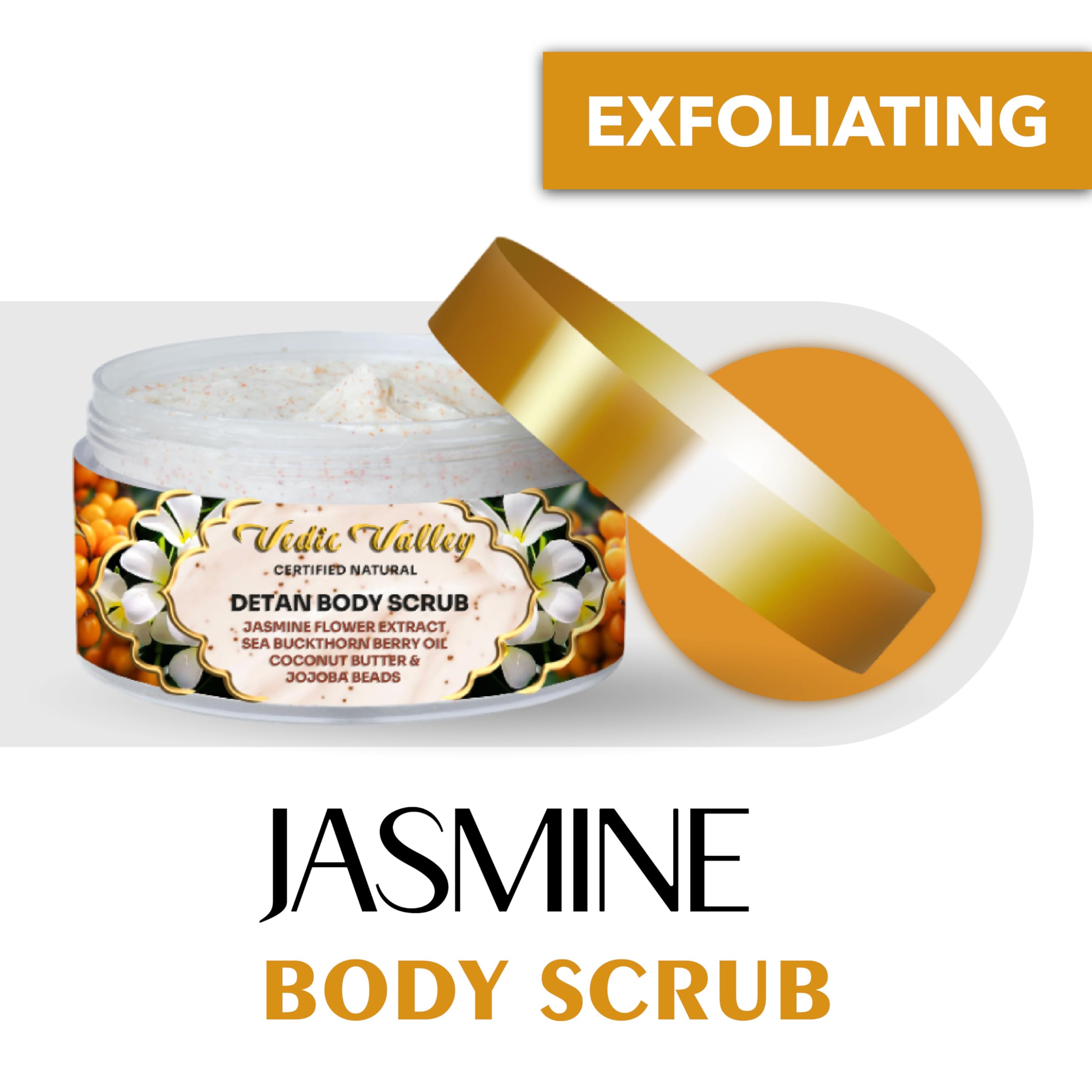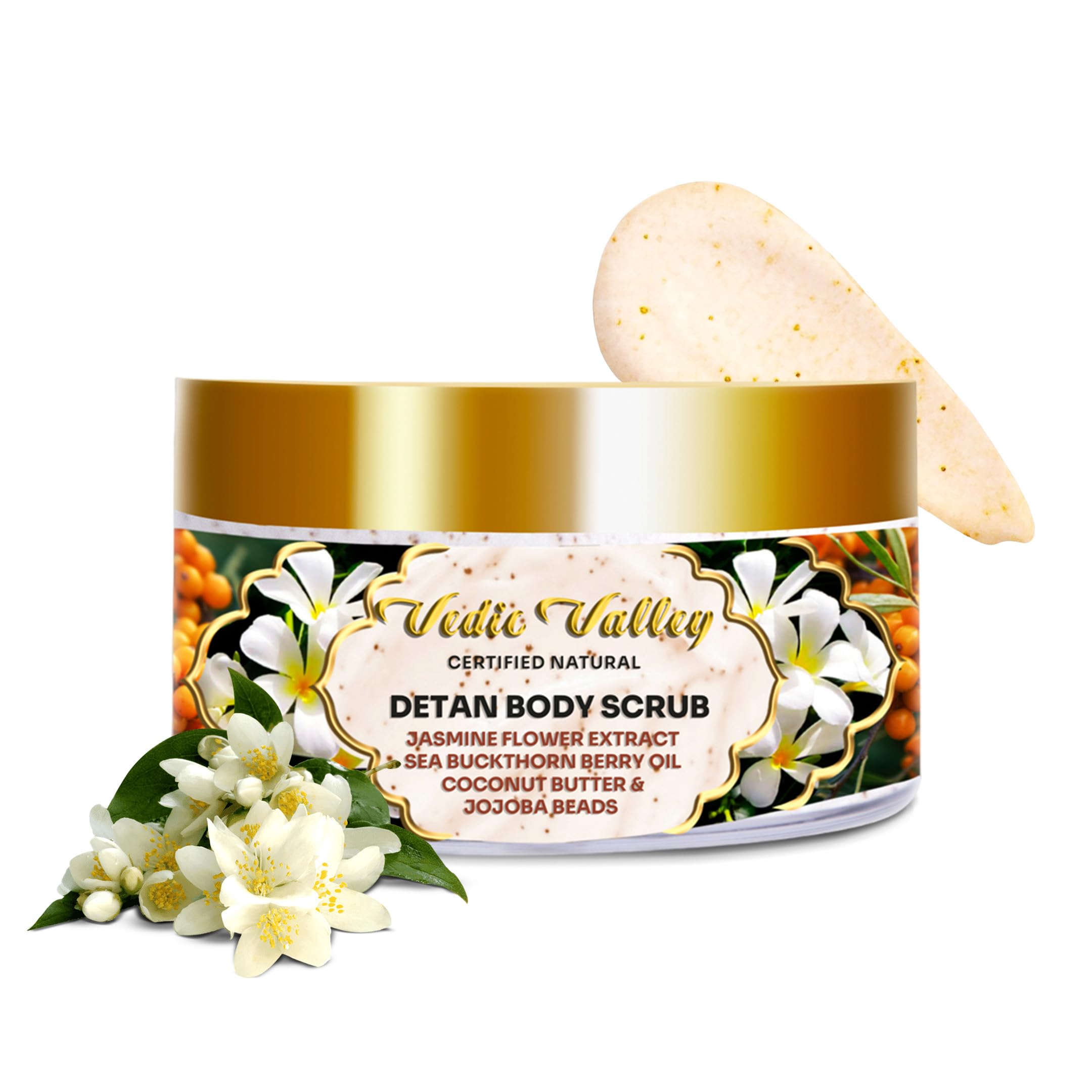 HomeHealth & PersonalSkin CareBody CareBody & BathVedic Valley Vegan Detan Jasmine Scrub with Organic Actives | Tan & Black Head Removal | Removes Dirt & Dead Skin from Neck Knees Elbows & Arms | Skin Brightening & Exfoliating Scrub For Men & Women | 250 gm