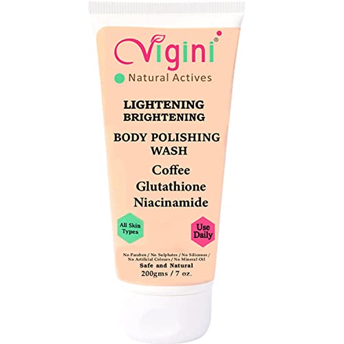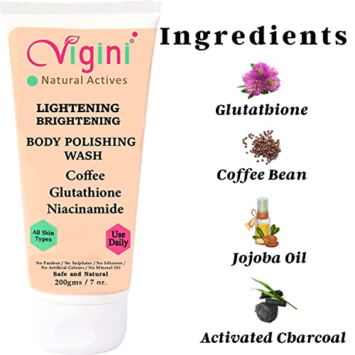 VIGINI Lightening Brightening Body Polishing Wash believes in purity and transparency we bring to you the heroes of our Body Wash. Let us know how the Natural actives and ingredients in the oil act to give you desired results. 1. Glutathione helps lightens complexion creates even skin tone by reducing dark spots & patches. 2. Alpha Arbutin and Mulberry work by reducing hyperpigmentation melanin darkening and thus lightening the skin tone giving fairness. Be it age spots acne scars or post-blemish redness Alpha Arbutin minimizes it all. 3. Niacinamide would help build keratin and makes skin firm and healthier. It o protects Skin against Sun damage; it minimises fine lines and signs of premature ageing. 4. Jojoba Oil hydrates moisturizes nourishes the skin and provides benefits. 5. Argan Oil nourishes & helps to improve the elasticity of the skin. 6. Coffee Bean Grains exfoliate & ify skin improve circulation Collagen Production and helps in removal of Imperfections. Removes Deep Dead cells De-Tans and provides glow with radiance 7. Vitamin C neutralizes oxidative damage caused by the sun and pollution. It o promotes collagen production brightening the skin. 8. Glycerine deeply hydrates the skin and leaves it soft and supple. It o refreshes the skin's surface 9. Activated  Beads work as natural exfoliator to remove dead skin cells with properties absorbs toxins and draws out impurities and dirt from your skin to make it fresher brighter and radiant. A more luminous skin tone will make you glow beautifully. It's the epitome of health and glamour 10. Allantoin moisturizes the skin to prevent dryness irritation exfoliates and soothens skin. 11. Aloevera Ext soothes sunburns moisturizes the skin slows down signs of ageing cleanses acne and fades blemishes. 12. Xanthan Gum hydrates & moisturizes skin.