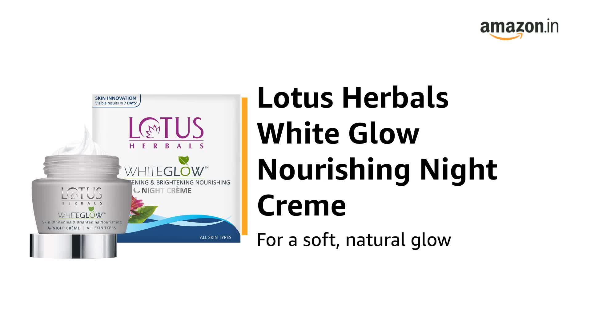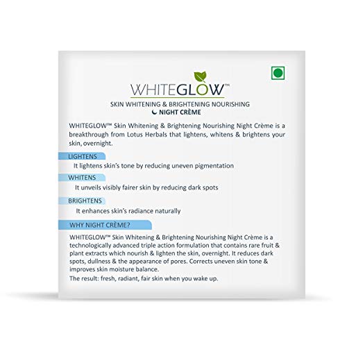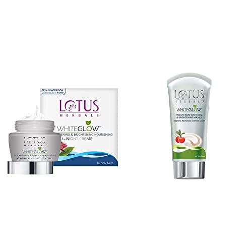 Lotus Herbals White Glow Skin Whitening And Brightening Nourishing Night Creme 60gEssential Night Care For Your Skin Imagine waking up to a fairer brighter you! Lotus Herbals White Glow Skin Whitening and Brightening Nourishing Night Creme does just that. Fortified with natural ingredients like Grapes and Mulberry this night Creme not only delivers essential nourishment to your skin but also reduces appearance of blemishes and darks spots to reveal a fairer looking you! Grapes Grapes are rich in resveratrol which controls skin ageing. It reduces fine lines an dwrinkles and makes yoru skin appear years younger. They also boost the production of collagen responsible for the elasticity of skin making your skin tighter and firmer. Mulberry Mulberry is rich in antioxidants which fight free radicals to protect your skin from damages and early signs of ageing. It is also responsible for synthesis of melanin which lightens pigmentation and results in a fairer clearer complexion. Saxifraga Extracts Saxifrage absorbs easily into the skin and treats skin blemishes and dark spots from within. It events out your skin complexion making your look brighter and fairer. It also stimulates cell renewals and promotes the formation of lipid barrier in your skin. Lotus Herbals White Glow Yogurt Skin Whitening And Brightening Masque 80gGentle Exfoliation Works on Dull and Uneven Skin Tones Removes Dirt and Impurities