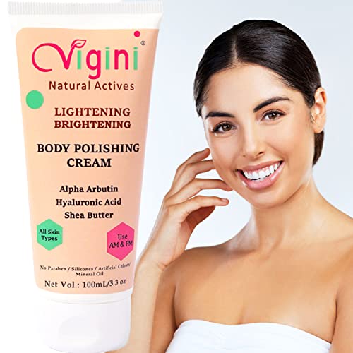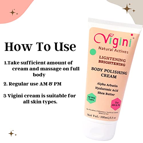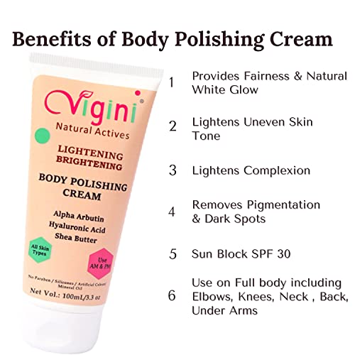 Vigini Body Polishing Cream contains skin brightening nourishing hydrating natural actives glycolic acid removes dead cells encourages collagen production and helps retain moisture giving radiance. Alpha Arbutin s melanin. Hyaluronic Acid Hydrates makes skin supple wrinkle free & plumpy. Kojic Acid s dark & sun damage spots Niacinamide moisturizes skin by increasing level of lis called Ceramides and Allantoin Olivem 1000 Jojoba Oil & Shea Butter provide deep nourishment nourishment and minimizes wrinkles Zemea a perfect humectant deeply humidifies skin for softness. Liquorice & Mulberry removes and prevent formation of melanin. Vitamin C gives bright radiant young skin