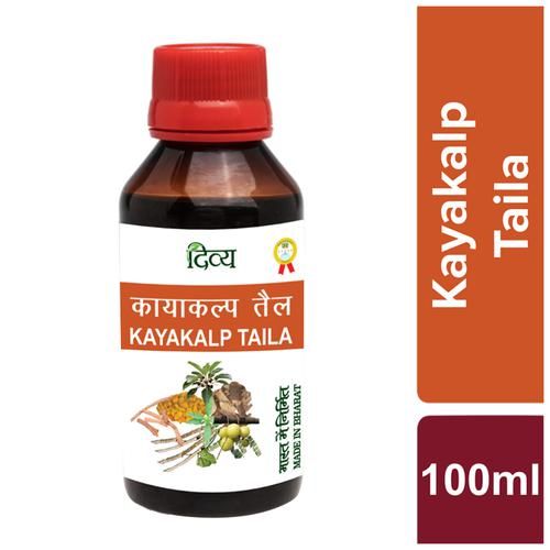 Divya Kayakalp Taila helps in treating the fungal infections, sunburns, allergies and in healing cracks and burns. It has anti o bacterial actions that helps to treat chronic conditions like leukoderma, freckles, eczema and itching. It helps in treating pigmentation and dark spots. It brings back the lost radiance. It gives quick relief in cracks of hands and feet. It also gives relief in cuts and burns and wounds. It curses all types of skin diseases. It also prevents from marks.Kayakalp Taila soothes itchiness and discomfort and nourishes your skin with care. It eliminates viruses that cause herpes, moisturises the skin thus healing cracks caused by dryness in hands and feet and heals psoriasis, pigmentation, marks left by skin disease, etc. The ingredients in Kayakalp Taila have antiseptic properties. It is our most popular and effective body oil.* Ring worm* Pigmentation* Dark spots* Itching* Leucoderma* Skin allergy* Bakuchi* Panwad Beej* Haldi* DaruHaldi* KhairChhal* Karanj Beej* Neem Chhal* Harad* Baheda* Amla* Manjeeth* Giloy* Chirayata* Kutaki* IndrayanMool* Chandan* Devdaru* Kali Jiri* Ushava* Dronpushpi* Satyanasi* Gomutra* TilTaila