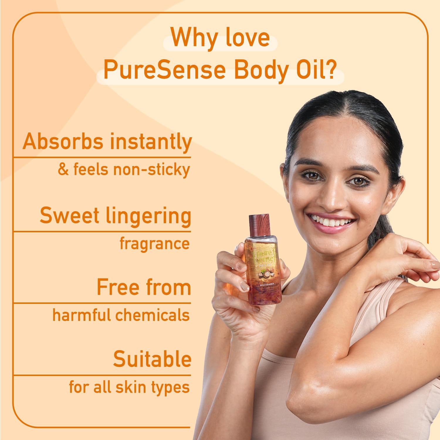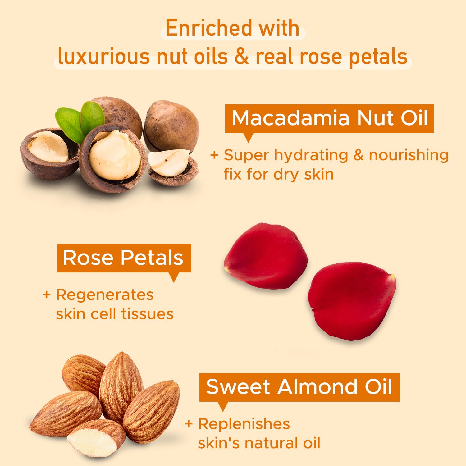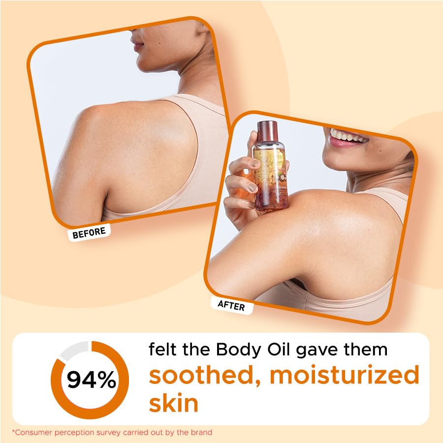 Indulge yourself in this unique blend of essential oils for a deeply nourished skin. Pure and gentle it is a delight for your senses and satiates your skin's thirst by providing intense moisturisation making it a perfect choice for dry skin. It boosts vitality soothes senses and regenerates skin tissues. This Deep Moisturising Body Oil works great as an after-bath body oil or massage oil and helps you relax the body. Formulated with the goodness of ethically sourced Macadamia Nut Oil sourced from Australia it is rich in Vitamin A Squalene Omega 7 and Vitamin E. It helps to minimize signs of ageing boosts collagen and glides deep into the skin for healthy intense nourishment. The body oil is infused with the cold-pressed Sweet Almond Oil which is loaded with Vitamin E and works on revitalizing skin and replenishing skin's natural moisture. Treat your body to wholesome goodness of pure Rose Petals that are rich in vitamins and minerals and render your skin with nourishment and senses with instant soothing. Made consciously without any toxins like sulphates parabens formaldehyde and mineral oil the Deep Moisturising Body Oil provides a layer of ultra-rich moisture protects the skin from damage soothes your senses and is pure above it all. This body oil has not been tested on animals and is free from chemicals. Go ahead mesmerise your skin and rejuvenate your mind with this pure potion.