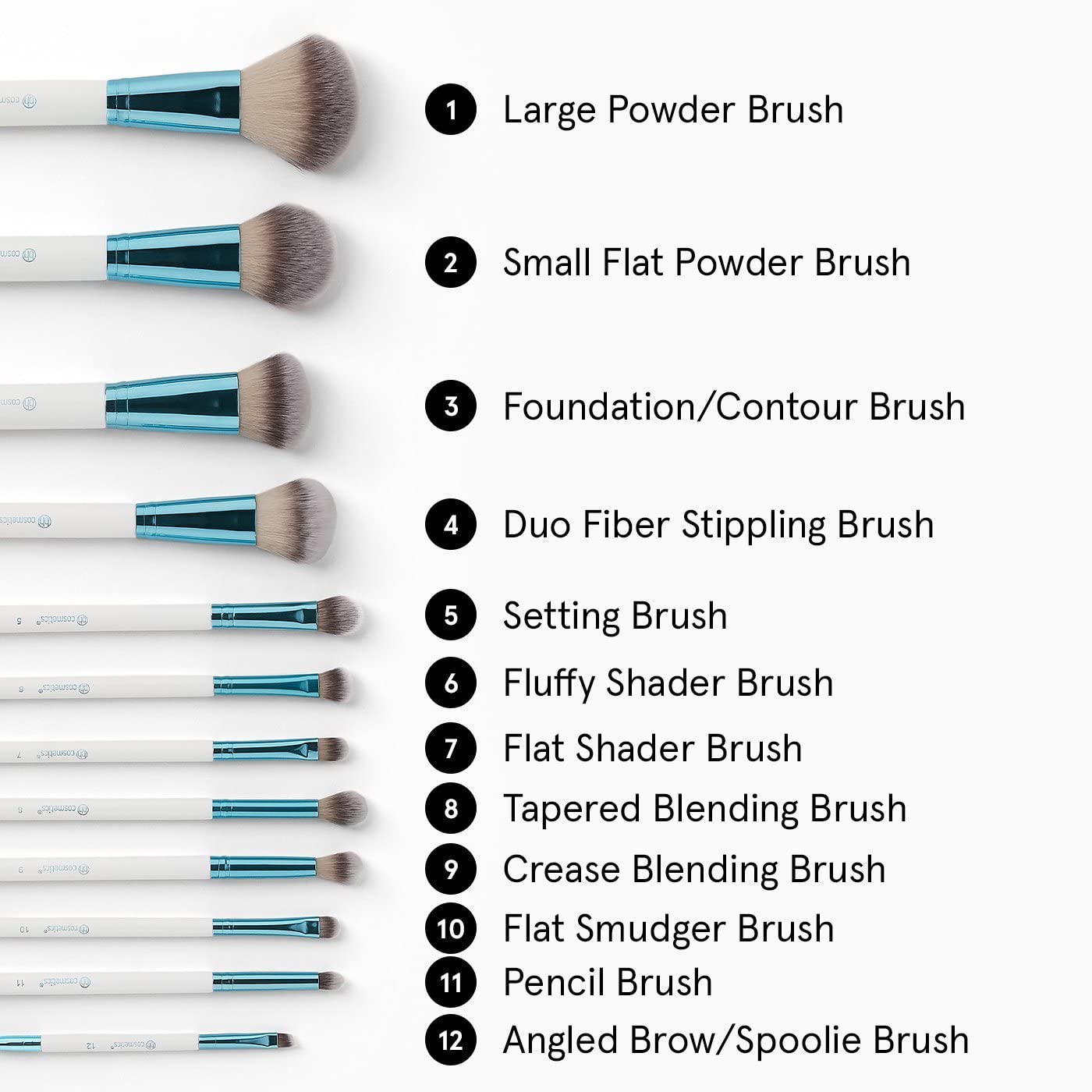 Embrace the essence of summer glam with our Poolside Chic â 12 Piece Brush Set a versatile collection of face and eye brushes that buff blend and luminate your features to perfection. Each brush has a teal-hued ferrule white handle and super-soft synthetic bristles that offer precision and luxury with every stroke. Plus the set comes with a sleek holographic bag for easy application to take you from a leisurely day in the sun to an elegant night on the town.