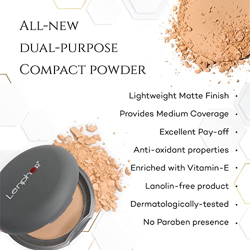 Get ready for the all-new dual-purpose compact powder by Lenphor Perfect Matte Compact. It accentuates your face with a sophisticated matte effect. Extremely light product enriched with Vitamin-E. You will love how effortlessly it blends with your skin to give you a flawless complexion. It is suitable for both face powder and blush textures. LightMatte Finish. Provides Medium Coverage. Excellent Pay-off, Anti-oxidant properties Enriched with Vitamin-E, Lanolin-free product, Dermatologically-tested, No Paraben presence.