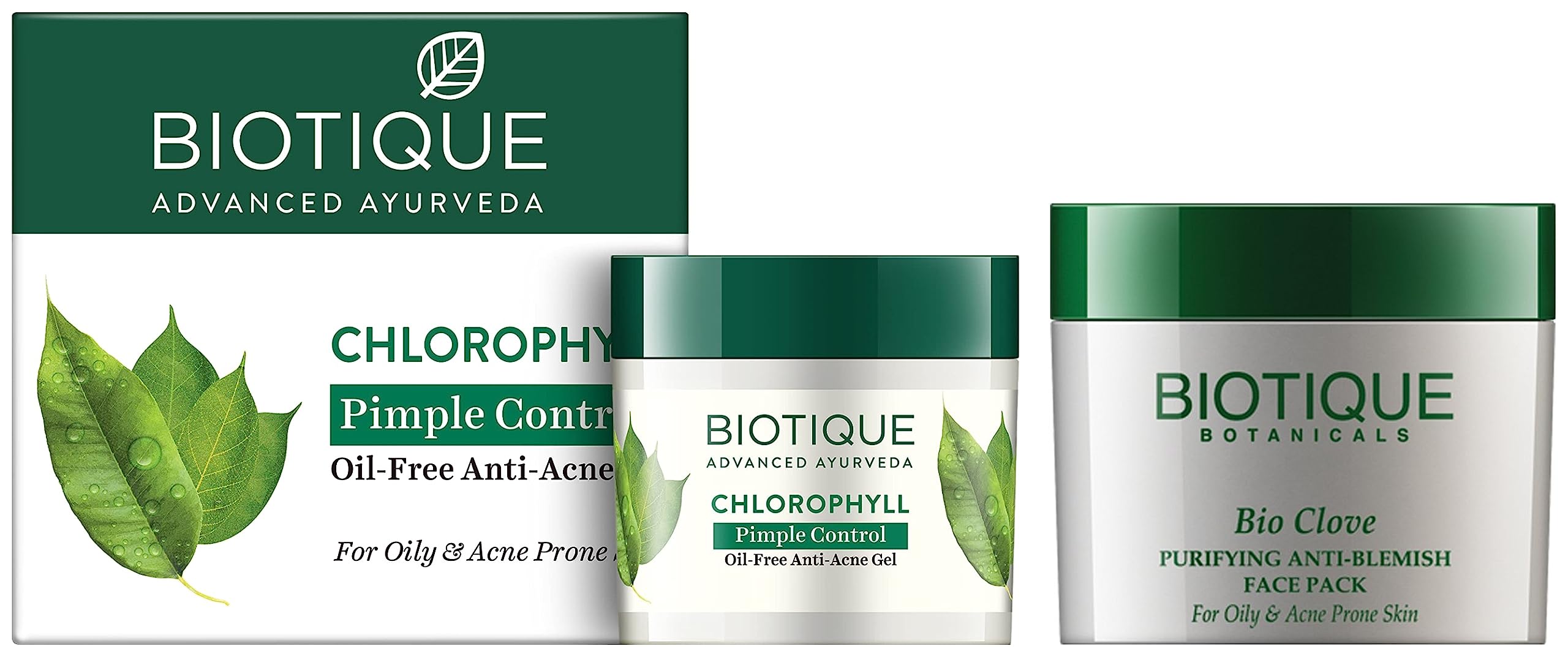 Biotique Bio Clove Purifying Anti Blemish Face Pack 75gThis product is a antibiotic antiseptic and antiviral purifying anti-blemish pack blended with pure clove and wild turmeric to control pimples absorb excess oils and other embedded impurities that can cause acneic conditions.Biotique Bio Chlorophyll Oil Free Anti-Acne Gel & Post Hair Removal Soother For Oily & Acne Prone Skin 50GIt tighten pores avert blemishes and keep skin nourished and clear without flaking.
