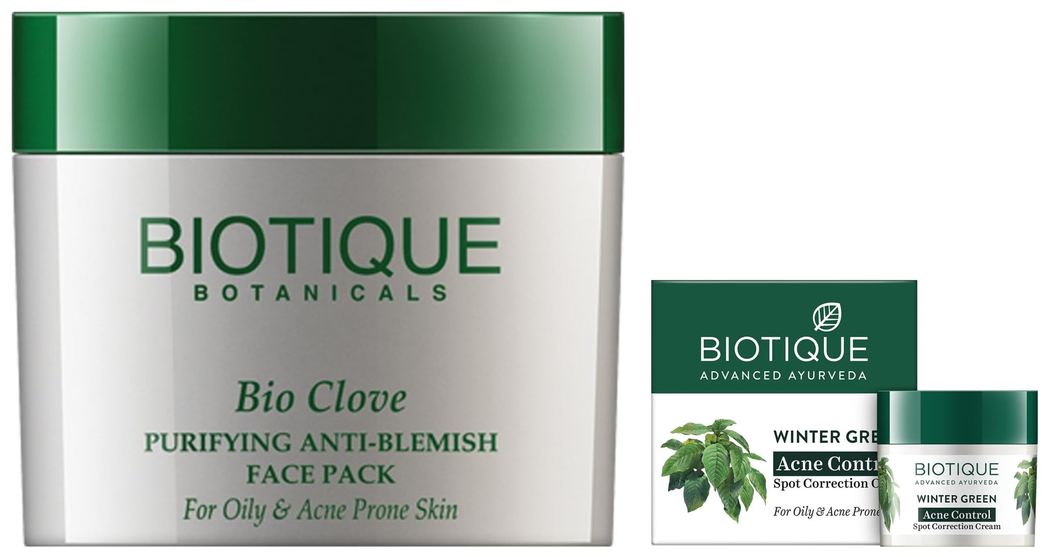Biotique Bio Clove Purifying Anti Blemish Face Pack 75gThis product is a antibiotic antiseptic and antiviral purifying anti-blemish pack blended with pure clove and wild turmeric to control pimples absorb excess oils and other embedded impurities that can cause acneic conditions.Biotique Bio Winter Green Spot Correcting Anti Acne Cream 15gBiotique Wintergreen Cream Spot Correcting Anti Acne CreamWinter Green is extracted from the leaves of a small evergreen herb which is known for its cooling healing anti-inflammtory actions. This soothing spot correcting cream helps clear up blemishes and promote poreless flawless skin without flakiness or dryness.It is a very useful combination of wintergreen oil neem oil and extracts of berberry and euphorbia to control acne and all sort of skin problems. It is a very effective anti-pimple treatment cream. The extracts of wintergreen and neem plants control pimples and acne. It shows quick results with oil of wintergreeen and as a result your skin becomes healthier and looks fresh.Direction for Use1. Apply to cleansed skin on affected areas only.2. Use morning and evening until skin is clear.Qty 15gm