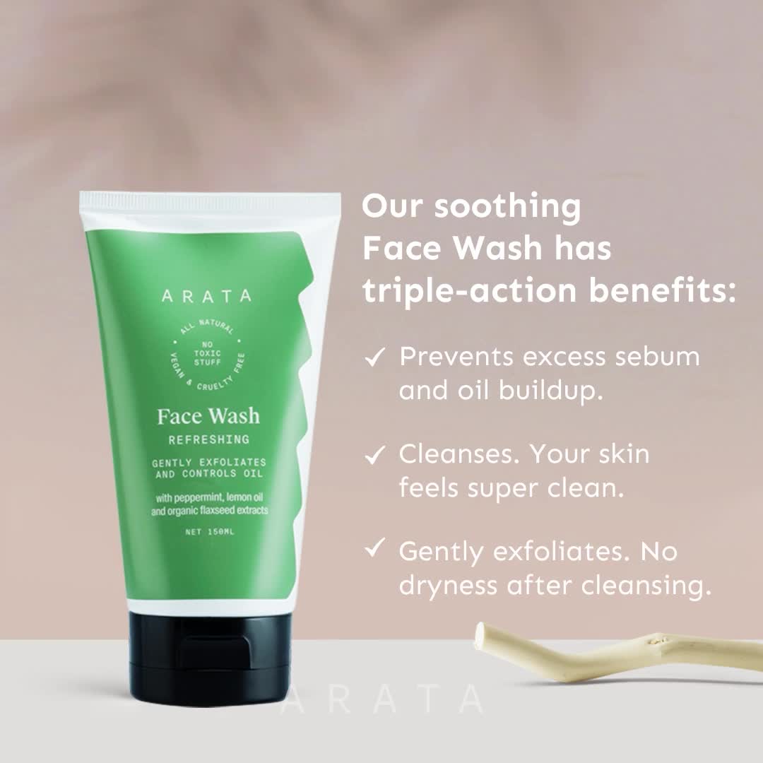 Arata Refreshing & Hydrating Face Wash 150ml | With Peppermint, Lemon Oil & Flax Seed Extracts | For Dry, Oily, Sensitive Skin | Detoxifies, Gently Exfoliates, Controls Oil and Dirt | For Women & Men
