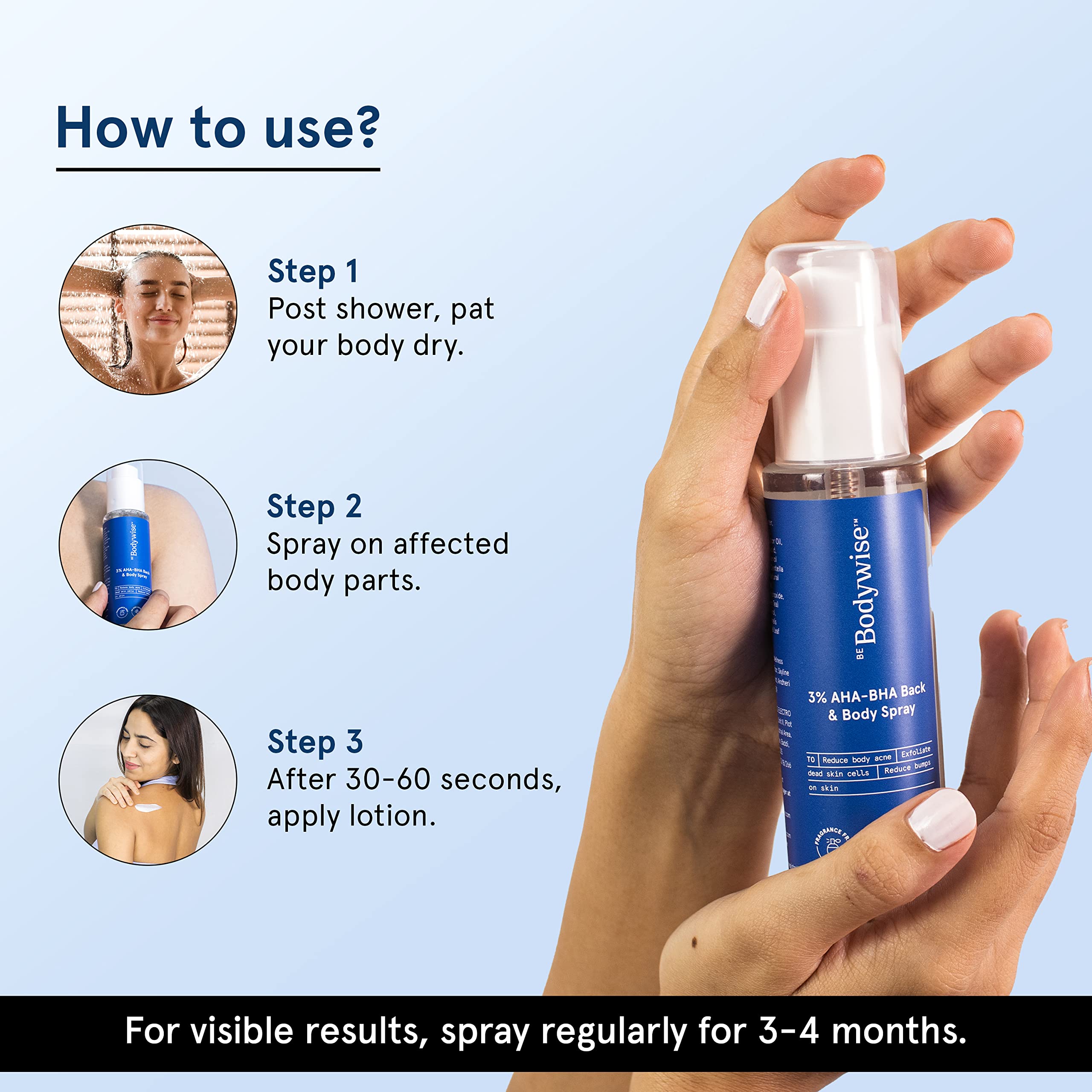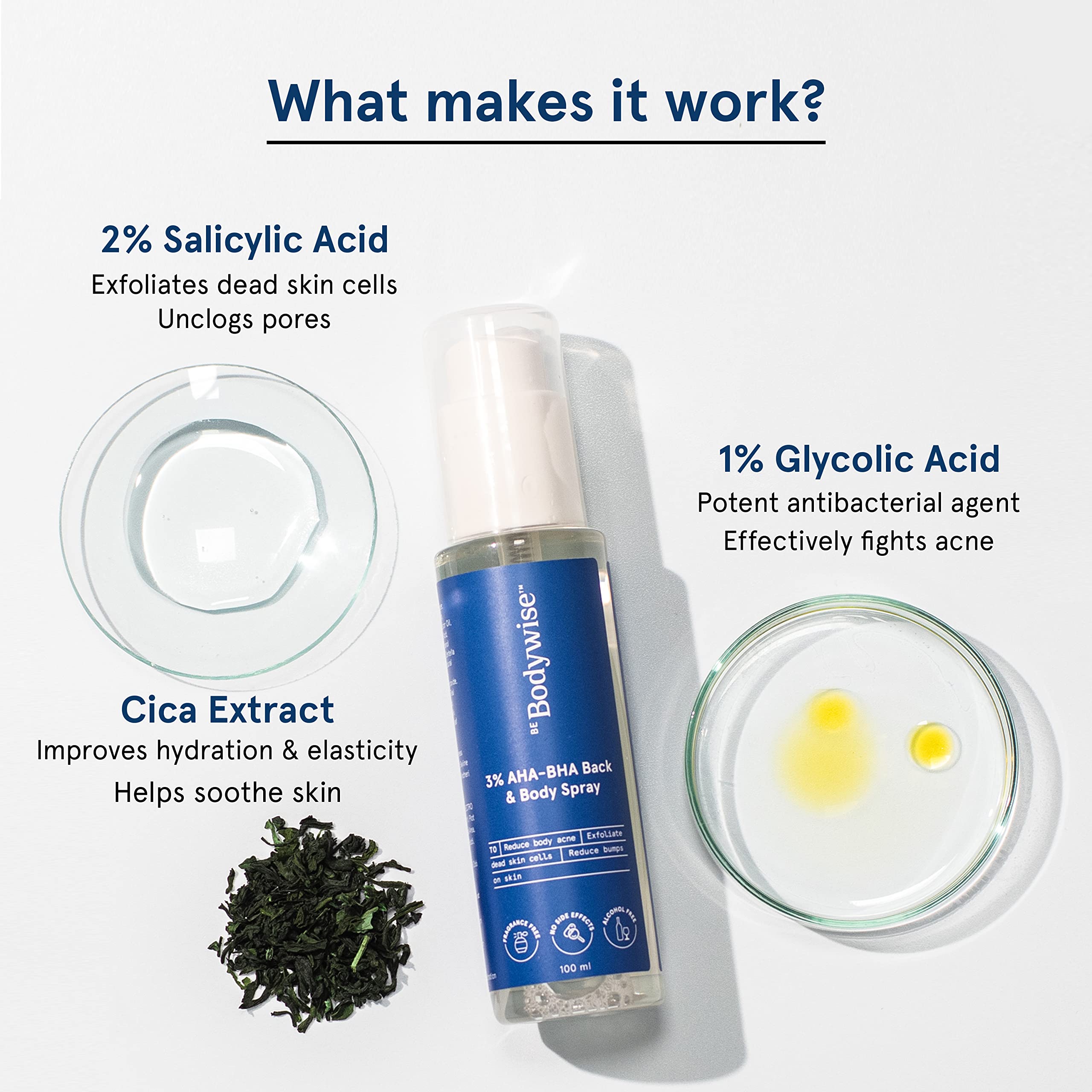 Product helped fix upper arm acne soon enough. No dryness either. Nor any pungent after smell.So content wise its 100/100However due to poor choice of packing it in a 'mist' spray bottle one ends up inhaling those fumes alongside significant product wastage. Must note, the silver lining on excellent 'lock' mechanism to avoid leakage during travel though.Will give them benefit of doubt to launch it with generic packaging - which arguably they'll remedy soon.Ideally this deserves as 4 star(1 short for packing).However keeping it 3/5 as contents absolutely should not have been inhaled due to current mist format.