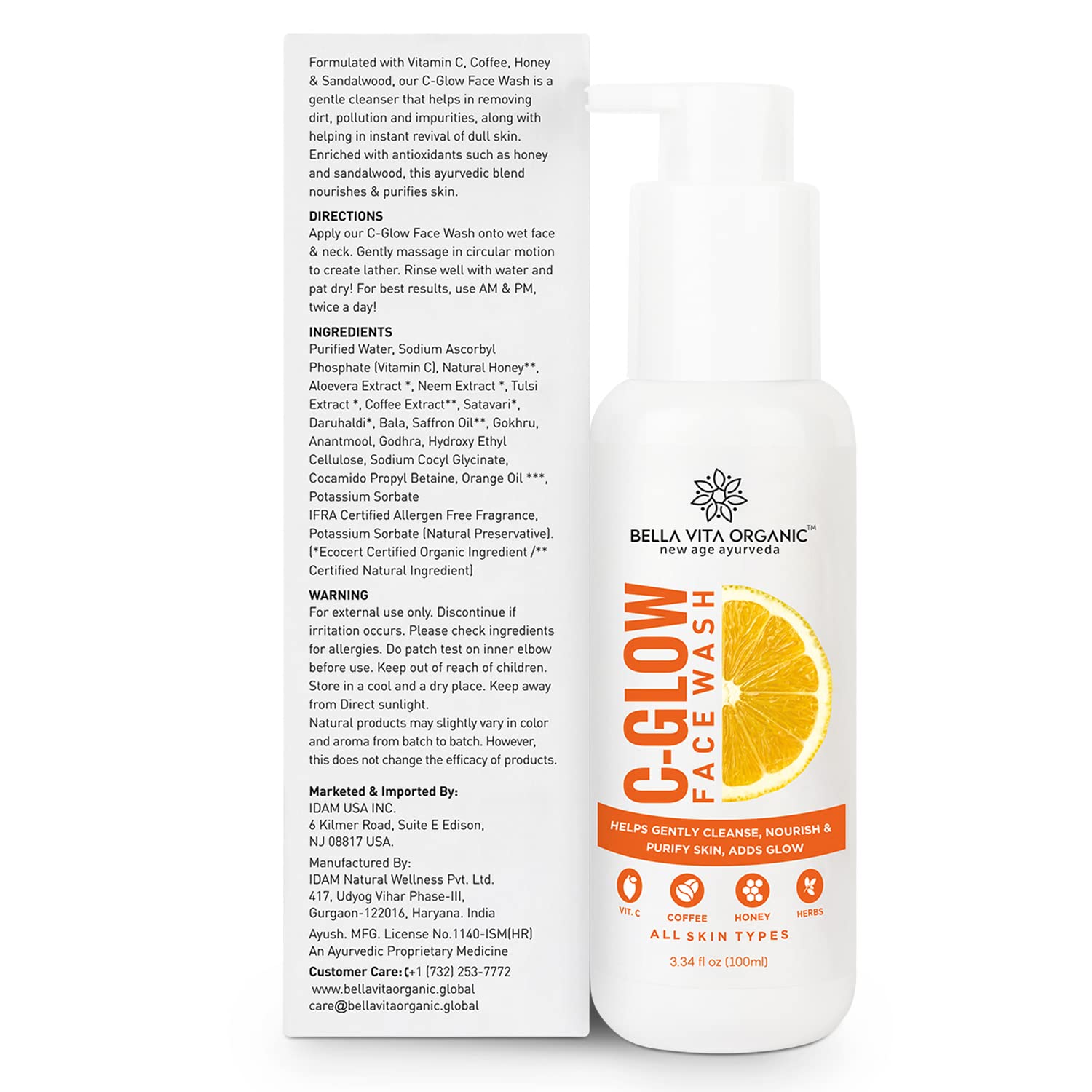 Bella Vita Organic Vitamin C-Glow Natural Face Wash with Honey, Aloe and Sandalwood, Oil Control, Acne Removal and Glowing Skin for Men and Women - 100 ml