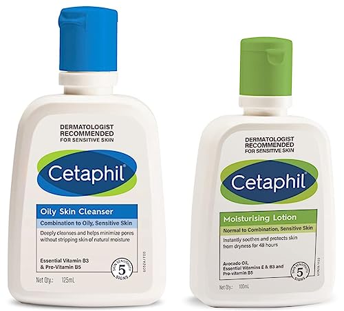 Cetaphil Moisturizing Lotion for Dry to Normal Sensitive Skin| 100 ml| Moisturizer with Niacinamide Panthenol| Non-greasy Wonât Clog Pores| Dermatologist Recommended| Paraben Sulphate FreeCetaphil Moisturising Lotion is specially formulated non-greasy lotion designed to retain skinâs natural moisture barrier. It is infused with natural ingredients such as Niacinamide Panthenol Glycerin Avocado and Sunflower Oil to lock in skin moisture and protect the skin. Ideal for Dry to Normal Sensitive Skin Cetaphil Moisturising Lotion is ⢠Paraben-Free ⢠Sulphate Free ⢠Fragrance-Free ⢠Hypoallergenic ⢠Non Comedogenic: Won't Clog PoresCetaphil Oily Skin Cleanser Daily Face Wash for Oily Acne prone Skin Gentle Foaming 125mlCetaphil oily skin cleanser reduces excess facial oiliness with Deep Pore Cleansing action without damaging skin barrier. It is Non-irritating Gentle Foaming rinses easily without leaving any residue and Moisturises the skin Ingredients: Purified Water PEG-200 Hydrogenated Glyceryl Palmate & PEG-7 Glyceryl Cocoate Sodium Lauroyl Sarcosinate Acrylates/Steareth - 20 Methacrylate Copolymer Gylcerol Sodium Laureth Sulfate Butylene Glycol Phenoxyethanol Dexpanthenol Methyl Parahydroxybenzoate PEG-60 Hydrogenated Castor Oil Fragrance Disodium EDTA