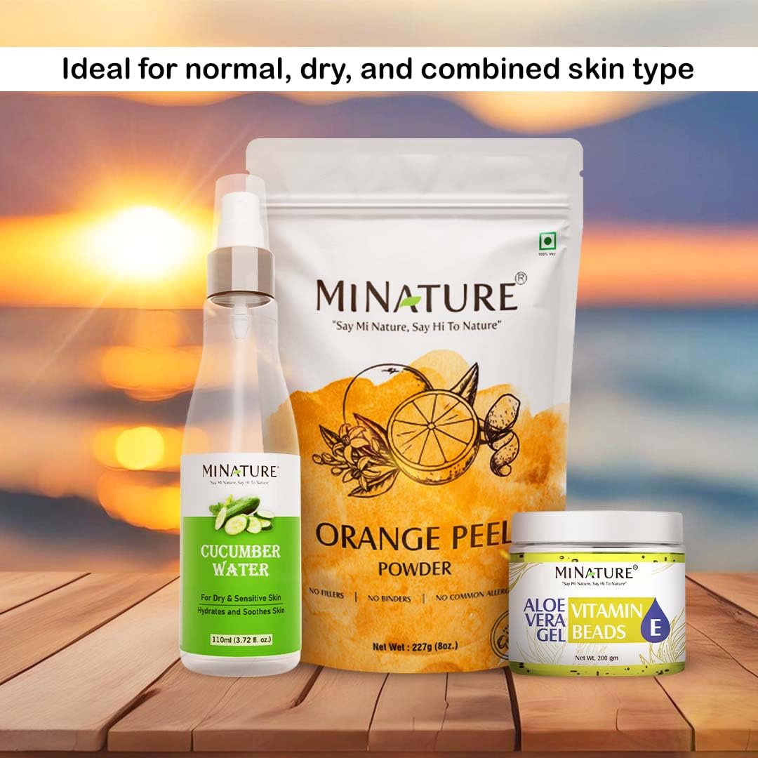 De-tan / Tan Removal Comboâ½Achieve naturally tan-free supple skin with this De-Tan Skin Care Combo! This all-natural kit combines the power of Orange Peel Powder Cucumber Aater and Aloe Vera Gel with Vitamin E Beads to gently exfoliate dead skin cells tan and remove pigmentation.â½Orange peel powder buffs away tan-causing dead skin cells while cucumber water cools down skin for a refreshed feeling. Aloe vera gel with vitamin E beads deeply hydrates leaving your skin feeling soft and supple.â½This gentle and effective combo is suitable for most skin types and can help you achieve more even-toned skin. Enjoy the convenience of creating your own DIY de-tanning face masks at home!How to use De-tan Combo:âMix Orange Peel Powder Aloe Vera Gel with Vitamin E beads and Cucumber Water Mist to form a smooth paste. âApply this paste to your cleansed skin and leave it on for 15 minutes. âScrub your skin in a gentle circular motion while rinsing with cold water. âUse a gentle moisturizer or you can use the Aloe Vera Gel with Vitamin E Beads.