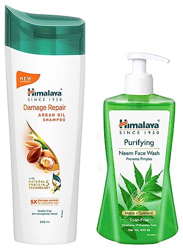 Himalaya Damage Repair Protein Shampoo | Repairs & Protects Hair from Damage | For Dry & Damaged Hair | With the Goodness of Beach Almond & Chickpea| For Women & Men | 400mlEveryday activities such as brushing blow-drying & straightening can cause significant damage to your hair. These cause commonly seen hair problems such as Hair Fall Dull Hair Frizzy Hair Hair Breakage Split Ends etc. Himalaya Damage Repair Protein Shampoo repairs hair & protects it from further damage. It is a uniquely formulated shampoo infused with the goodness of Beach Almond & Chickpeas to provide unmatched protection & care for your hair. Our Damage Repair Shampoo is safe to be used on all hair & skin types. Use Himalaya Damage Repair Protein Conditioner after shampoo for best results.Himalaya Purifying Neem Face Wash 400 mlHimalaya purifying neem face wash is a soap free herbal formulation that cleans impurities and helps clear pimples. A natural blend of neem and turmeric bring together their antibacterial and antifungal properties to prevent the recurrence of acne over time. Neem is an excellent skin care ingredient known for its antibacterial properties. It improves general skin health and immunity combating bacterial infections such as acne boils and ulcers. Neem tackles bacteria from the root and prevents the recurrence of pimples and blemishes. Turmeric has been used as an antiseptic for centuries and it is regarded as one of nature's most powerful healers. The herb helps to even out your skin tone and colour making it an excellent ingredient in a face wash. It also helps to retain the skin's elasticity making it supple. Turmeric has strong anti-inflammatory properties which soothe your skin.