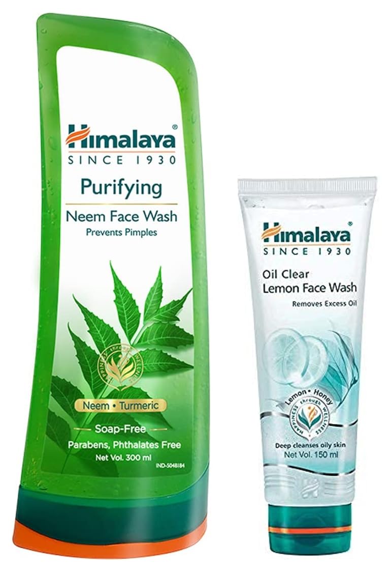 Himalaya Herbals Purifying Neem Face Wash 200ml (Pack of 2)Himalaya Purifying Neem Face Wash is a clinically proven soap-free formulation made with the unique combination of the time-tested herbs Neem and Turmeric. This pimple expert gently removes impurities helping prevent and clear pimples. Neem well-known for its antibacterial properties kills problem-causing bacteria. Turmeric improves skin health.Himalaya Oil Clear Lemon Face Wash 150mlHimalaya's Oil Clear Lemon Face Wash is a soap-free herbal formulation that gently cleanses your face and removes excess oil. Blended with lemon an astringent and cooling agent and honey which has natural deep cleansing properties the face wash leaves your skin clean without feeling dry and stretched.