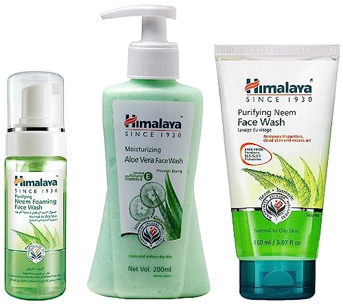 Himalaya Herbals Purifying Neem Foaming Face Wash 150mlPurifying Neem Foaming Face Wash: Fights skin impurities. What it does: Himalaya's Purifying Neem Foaming Face Wash developed after extensive research is a combination of Neem Turmeric and Vetiver. Neem is well-known for its antibacterial antiviral and germicidal properties which help control acne pimples and prevents their recurrence. Turmeric has antiseptic characteristics and soothes the skin. Vetiver cools the skin and has antibacterial properties. Key ingredients: Neem Oil and Neem leaves are excellent skin care ingredients. The oil relieves dry skin and soothes itchiness redness and irritation. It also improves general skin health and immunity combating bacterial infections such as acne boils and ulcers. Turmeric has been used as an antiseptic for centuries and it is regarded as one of nature's most powerful healers. The herb helps to even out your skin tone and color making it an excellent ingredient in a face wash. It also helps to retain the skin's elasticity and makes it supple. Turmeric also contains strong anti-inflammatory properties which soothe your skin. The soothing and cooling effect of Vetiver pacifies skin inflammation. Its antibacterial properties help in healing skin conditions like acne.Himalaya Moisturizing Aloe Vera Face Wash 200mlHimalaya's moisturizing aloe vera face wash is a soap-free formulation that replenishes lost moisture from your skin after every wash eradicating dry and stretched skin. It is enriched with cucumber which cools and soothes while aloe vera tones and softens your skin. Our moisturizing aloe vera face wash combines natural ingredients to cleanse your skin leaving it feeling fresh and glowing.Himalaya Herbals Purifying Neem Face Wash 150mlHimalaya Herbals Neem Face Wash 150ml removes impurities from the skin and helps in clearing pimples. It is a soap-free and herbal formulation along with being a natural mix of Neem and Turmeric. This product effectively restores your skin's natural health and vitality. The face wash comes in an easy to use tube which can be conveniently carried in your bag too. Himalaya Herbals Purifying Neem Face Wash primarily works towards helping one get rid of irritating pimples and acne. With its soap-free base and herbal formulation it cleans the pores of the facial skin and helps remove pimples eventually. This neem face wash contains a blend of turmeric and neem which are considered to be good antifungal and antibacterial elements. Regular use of this face wash keeps the acne from growing back again. It contains neem oil which provides great care to the skin by relieving dry skin and comforting the skin from any redness or irritation. In case of any cuts or wounds use of this face wash prevents any burning sensations on that area while cleaning. Neem deals with the bacteria and prevents any blemishes or marks to reappear. Turmeric being the second most important ingredient of this face wash is considered to be a great antiseptic and a powerful healer. Gradual use of this face wash makes the skin look even without any partial pigmentation. Himalaya Herbals Purifying Neem Face Wash coming in a tube of 150 ml helps moisten the face purify the pores by deep cleansing and works perfect for all skin types. This product is safe for daily use and could be used multiple times in a day to get best results. Product Features It can be used both by men and women. Comes in a 150 ml tube. Contains turmeric and neem oil. Has a soap-free base. Kills bacteria. Helps prevent regrowth of acne.
