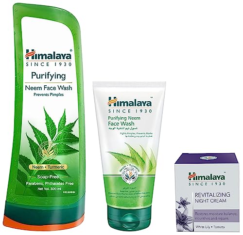 Himalaya Herbals Revitalizing Night Cream 50gOur face is the worst affected area of our body. It is always exposed to pollution the harmful UV rays of the sun and dust. Being sensitive the facial skin also gets affected due to beauty or bodycare products with strong chemicals and the obvious results are blemishes rashes and skin irritation. The Himalaya Herbals Revitalizing Night Cream has herbal extracts to fix all kinds of skin issues and renew that lost lustre in your skin. It is clinically proven that our skin pores are set loose when we sleep hence it absorbs nutrients the most. The Himalaya Herbals Revitalizing Night Cream has natural elements like Lemon Crab Apple Wheat White Lily and Tomato. All these ingredients help add health to a dull skin. Lemon has antiseptic properties and works as a natural bleaching agent making the skin fairer and free from pimples. Crab Apple has keratolytic qualities which keeps the skin cool and reduces inflammation. Wheat has been used since time immemorial as a skin remedy because it works wonders on sunburns damaged skin wrinkles and dark patches. White Lily has glycolic acid that makes the skin bright fair and glowing. Last but not the least Tomato being rich in Vitamin C works as an anti-oxidant improving the complexion and texture of the skin. Stress and pollution is another major concern for working women. In order to get rid of these we go for facials so that the suppleness of our skin is restored. Himalaya night cream ensures that you don't lose the natural appeal and elasticity of your skin. Use it daily after cleaning and toning your skin and wait to behold the magical result.Himalaya Herbals Purifying Neem Face Wash 300mlHimalaya's purifying neem face wash is a soap free herbal formulation that cleans impurities and helps clear pimples. A natural blend of neem and turmeric bring together their antibacterial and antifungal properties to prevent the recurrence of acne over time. Neem is an excellent skin care ingredient known for its antibacterial properties. It improves general skin health and immunity combating bacterial infections such as acne boils and ulcers. Neem tackles bacteria from the root and prevents the recurrence of pimples and blemishes. Turmeric has been used as an antiseptic for centuries and it is regarded as one of nature's most powerful healers. The herb helps to even out your skin tone and color making it an excellent ingredient in a face wash. It also helps to retain the skin's elasticity making it supple. Turmeric has strong anti-inflammatory properties which soothe your skin.Himalaya Herbals Purifying Neem Face Wash 150mlHimalaya Herbals Neem Face Wash 150ml removes impurities from the skin and helps in clearing pimples. It is a soap-free and herbal formulation along with being a natural mix of Neem and Turmeric. This product effectively restores your skin's natural health and vitality. The face wash comes in an easy to use tube which can be conveniently carried in your bag too. Himalaya Herbals Purifying Neem Face Wash primarily works towards helping one get rid of irritating pimples and acne. With its soap-free base and herbal formulation it cleans the pores of the facial skin and helps remove pimples eventually. This neem face wash contains a blend of turmeric and neem which are considered to be good antifungal and antibacterial elements. Regular use of this face wash keeps the acne from growing back again. It contains neem oil which provides great care to the skin by relieving dry skin and comforting the skin from any redness or irritation. In case of any cuts or wounds use of this face wash prevents any burning sensations on that area while cleaning. Neem deals with the bacteria and prevents any blemishes or marks to reappear. Turmeric being the second most important ingredient of this face wash is considered to be a great antiseptic and a powerful healer. Gradual use of this face wash makes the skin look even without any partial pigmentation. Himalaya Herbals Purifying Neem Face Wash coming in a tube of 150 ml helps moisten the face purify the pores by deep cleansing and works perfect for all skin types. This product is safe for daily use and could be used multiple times in a day to get best results. Product Features It can be used both by men and women. Comes in a 150 ml tube. Contains turmeric and neem oil. Has a soap-free base. Kills bacteria. Helps prevent regrowth of acne.