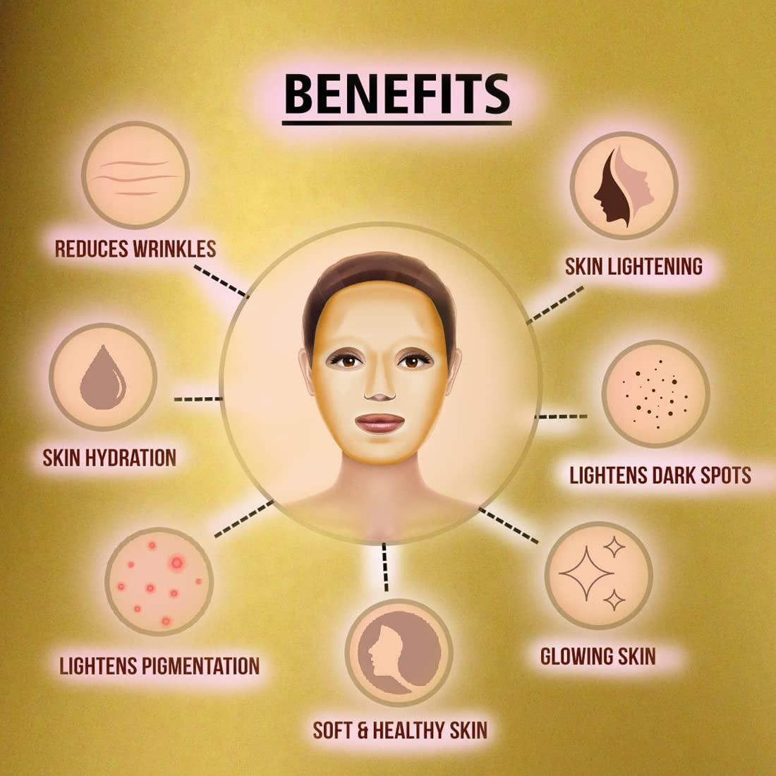 Increases skin elasticity improves blood circulation promotes brighter complexion and heals skin damage caused by sun rays. Reduces the appearance of blemishes and brightens the skin over time.