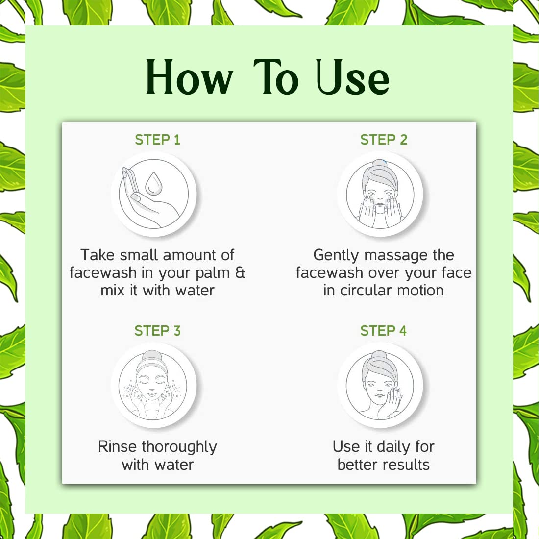 Usage: Apply Face Wash on a moist face and massage. Gently work up a lather using a circular motion. Wash off and pat dry and use twice daily.