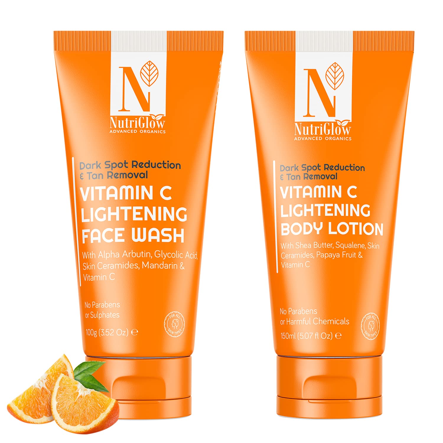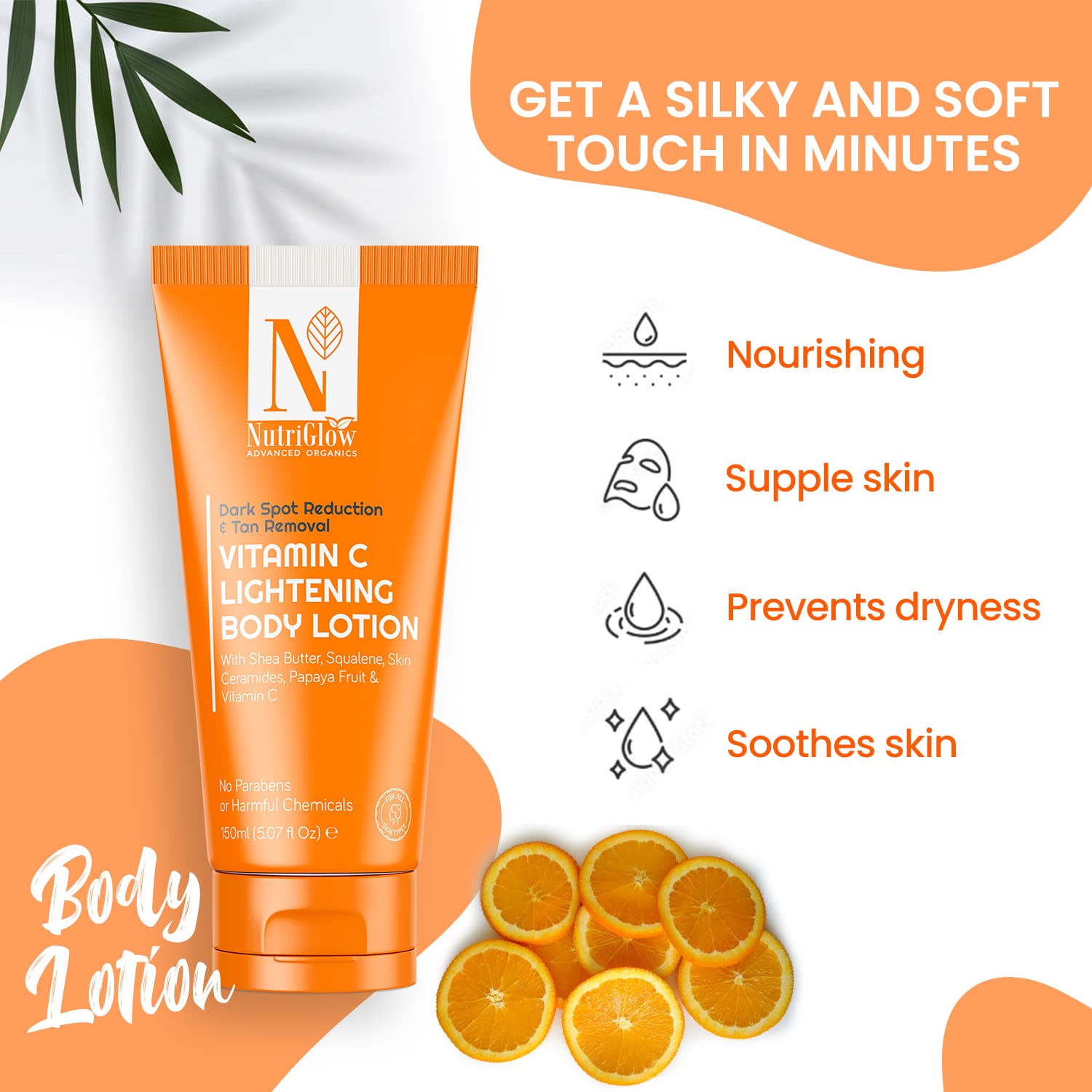 The Vitamin C Lightening Face Wash is curated with all the extracts of natural components that can help remove impurities dead skin and pigmentation from the face. This face wash is enriched with a high-quality concentration of alpha arbutin glycolic acid skin ceramides mandarin and vitamin C to give you a perfect natural glow. The natural raw extracts of orange peels and lemon oil are infused to give you a brighter lighter complexion as they will help skin collagens and remove impurities and dead skin from the face. A creamy non-greasy and ultra-lightbody lotion will help your skin get a supple hydrated and brightening effect. This NutriGlow Advanced Organics Vitamin C Lightening Body Lotion formulation includes vitamin C extracts shea butter squalene Skin ceramides and papaya fruit with brightening and healing properties. This particular body lotion is perfectly suitable to be worn in any climate as the body requires deep nourishment in all seasons.