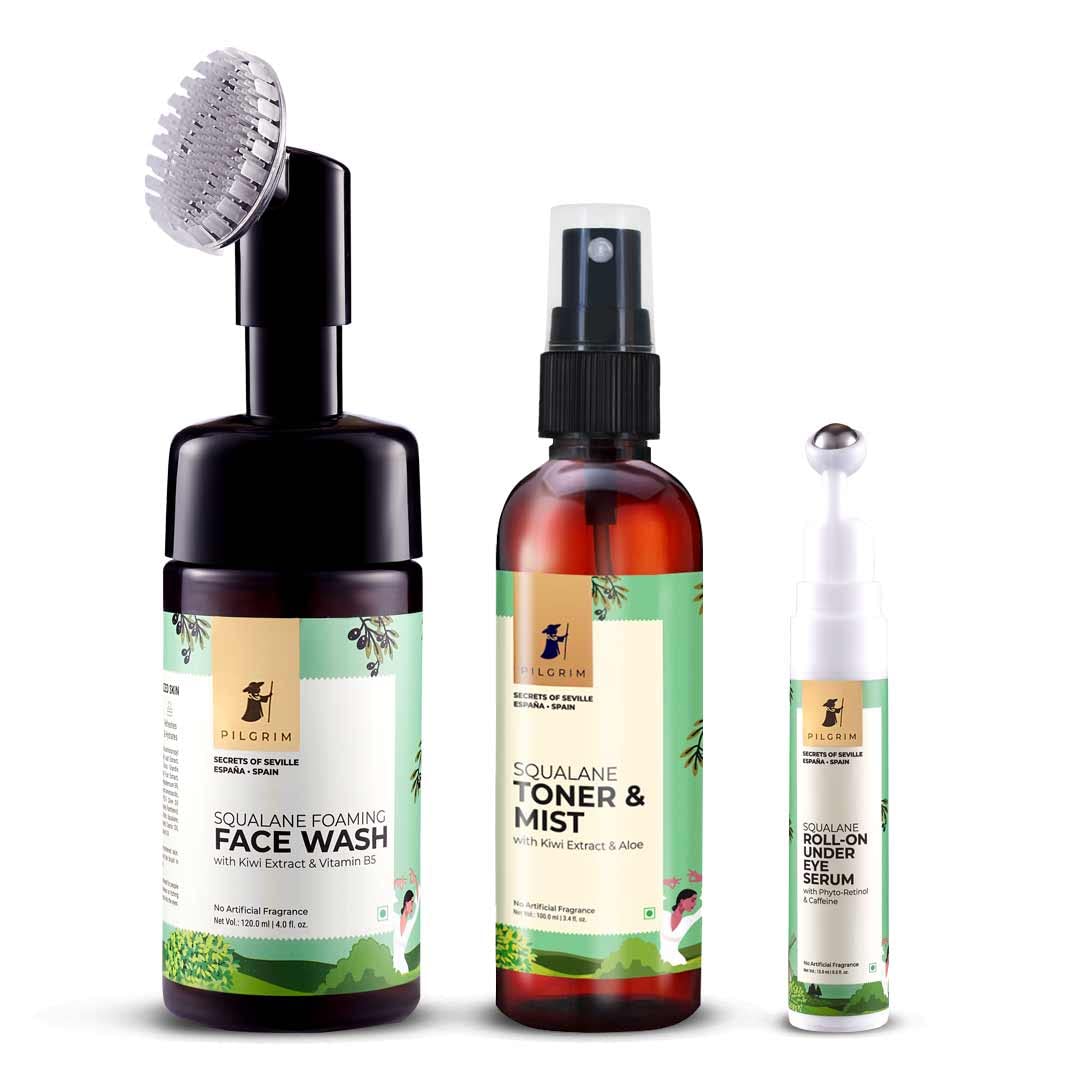 Pilgrim Under Eye Serum is a luxurious under-eye spa designed to refresh and rejuvenate. A gentle glide of the roll-on serum applicator deeply hydrates. Squalane Foaming Face Wash is a gentle cleanser that leaves skin soft and naturally glowing. Perfectly crafted to help remove dirt and makeup it does not over-dry and effectively retains natural oils.Squalane Toner & Mist is a featherweight hydrator that delivers a dewy natural glow throughout the day. Squalane locks in the much-needed moisture giving a youthful feel.