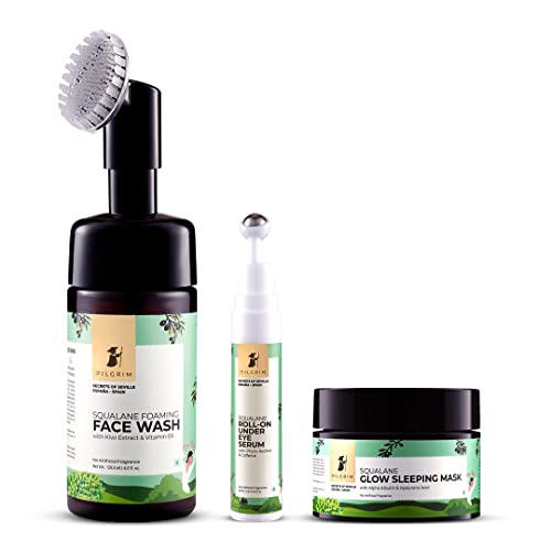 Pilgrim Essential Night Care Facial Kit Ritual Foaming Face Wash with Brush120ml, Roll-on Under Eye Serum 15ml, Squalane Glow Sleeping Mask 50gm|Reduce Dark Circles,Puffiness & Fine Lines|Glowing Skin