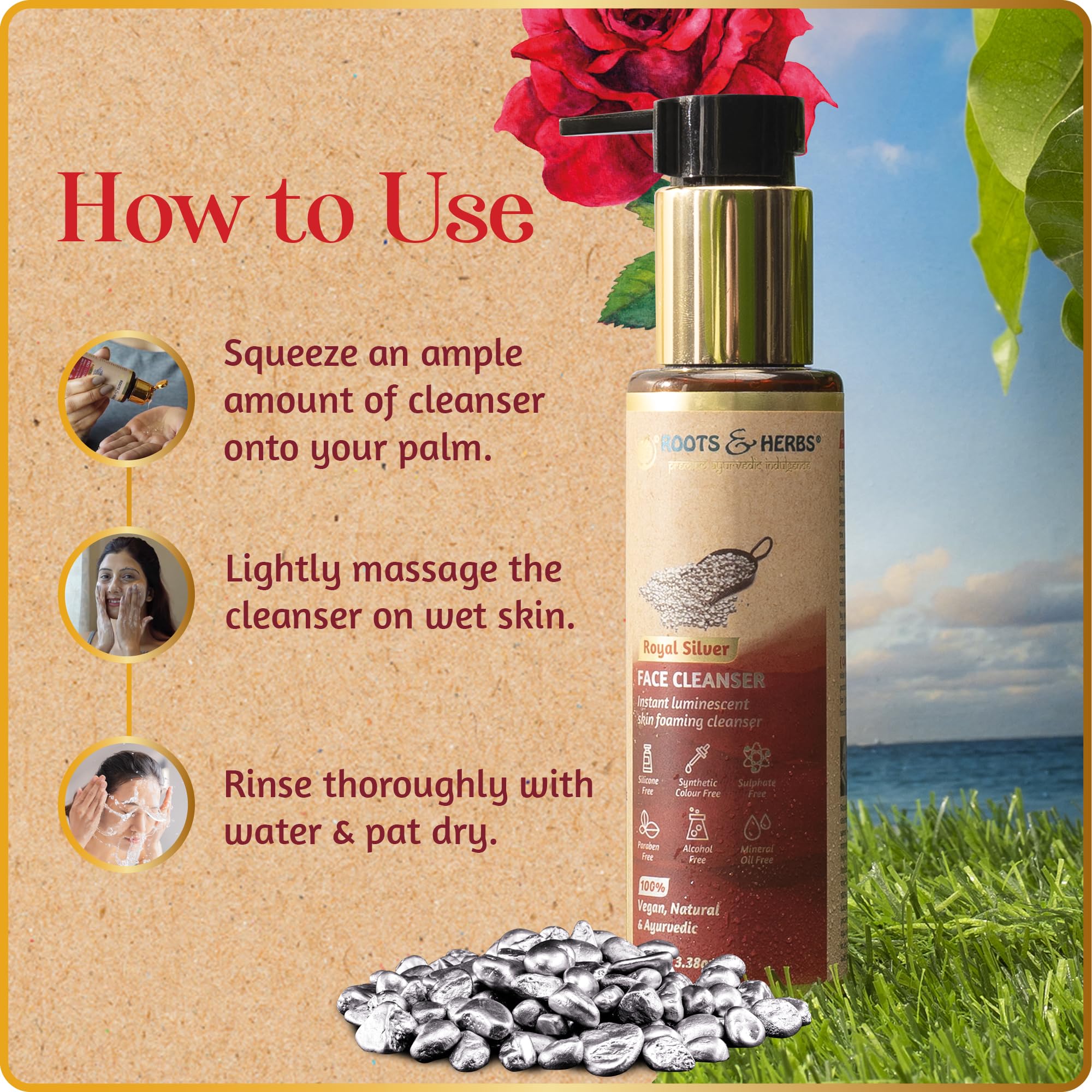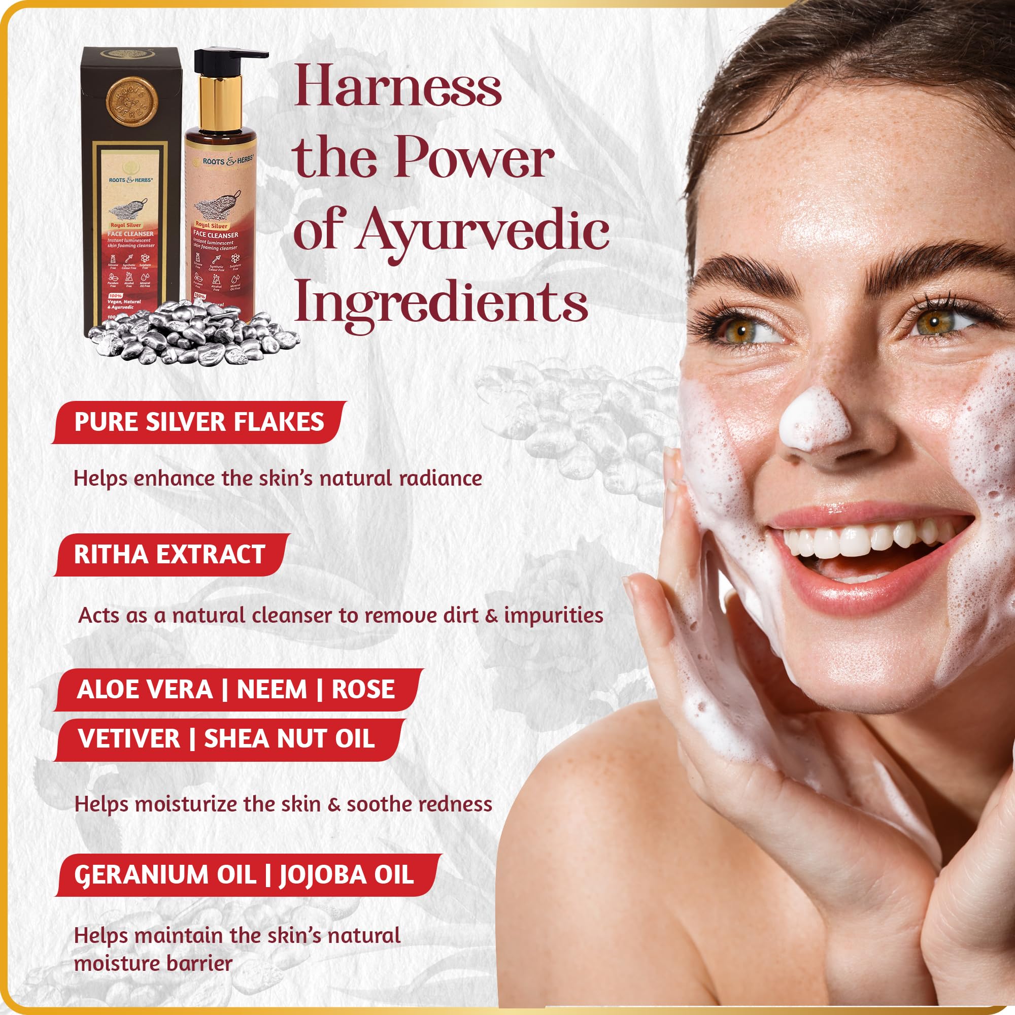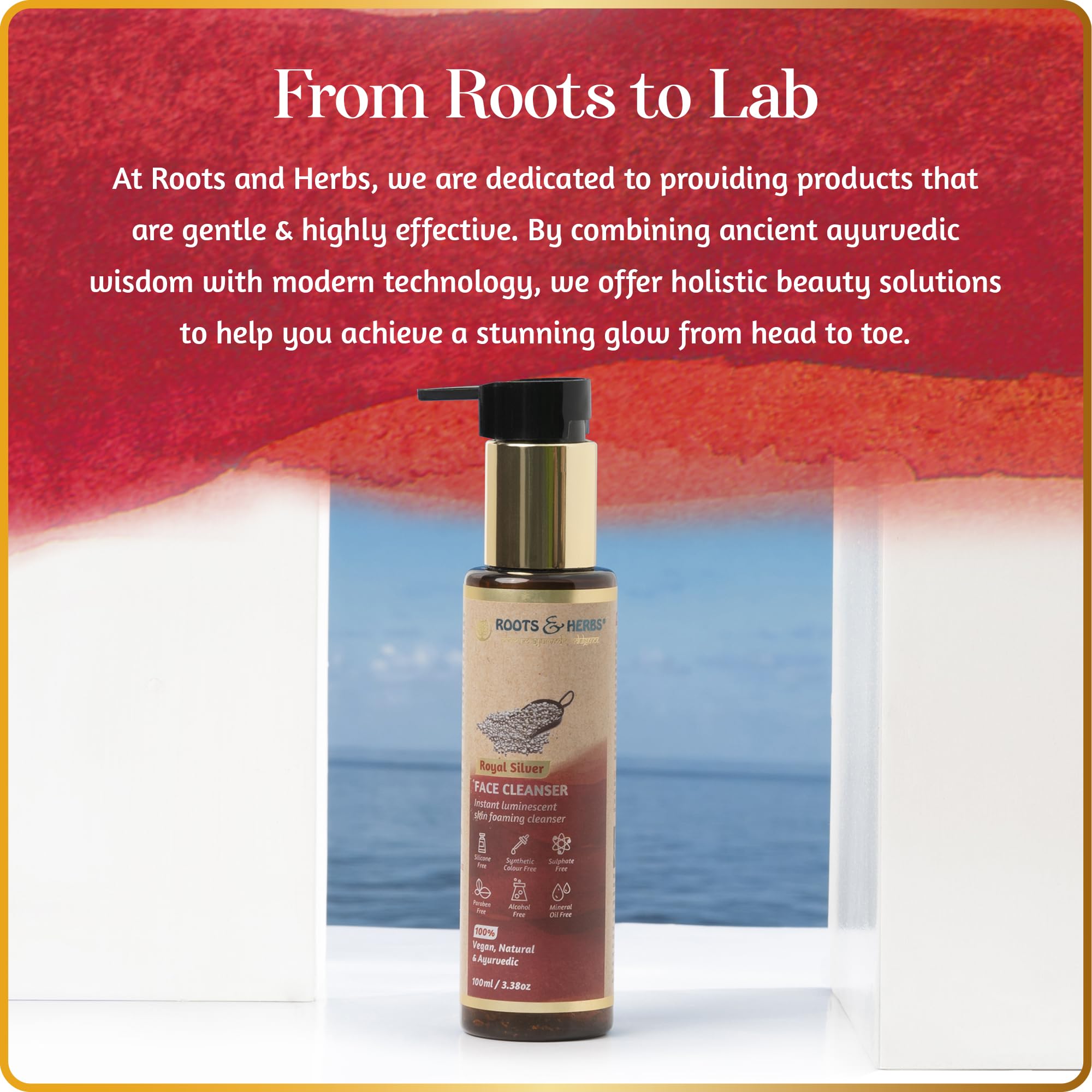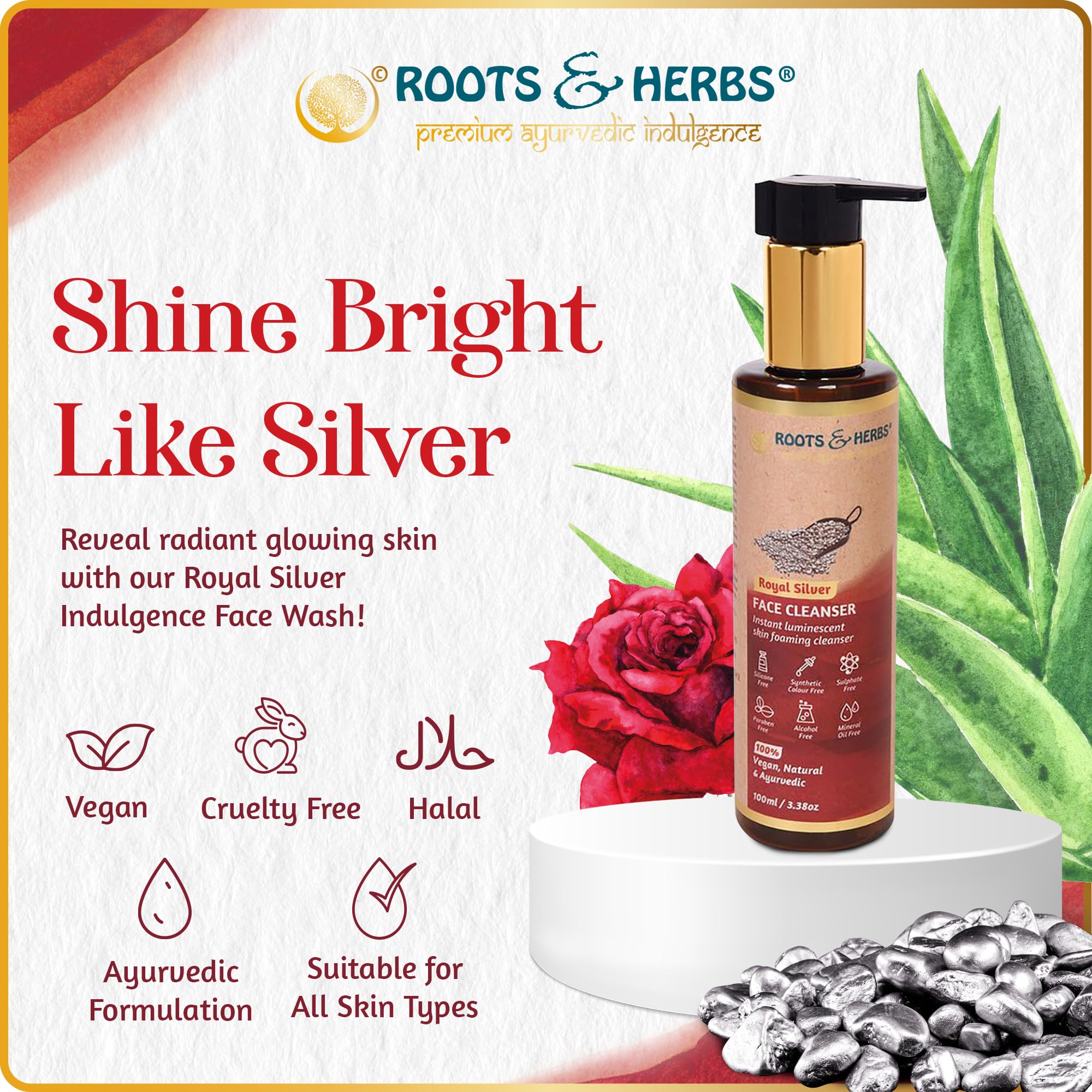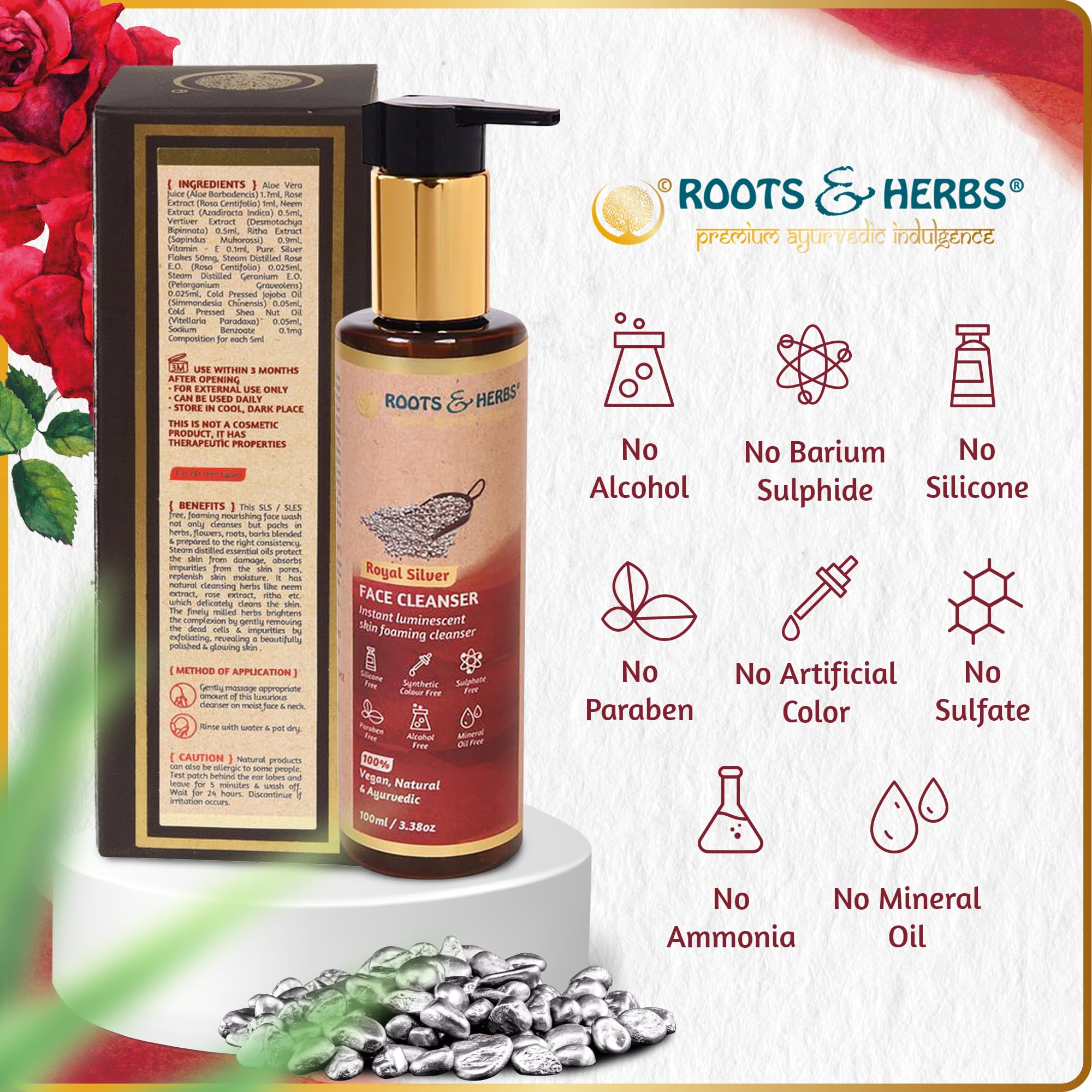 Roots & Herbs Ayurvedic Aromatherapy Vegan Royal Silver Indulgence Face Wash Cleanser for Men and Women - 100 ml