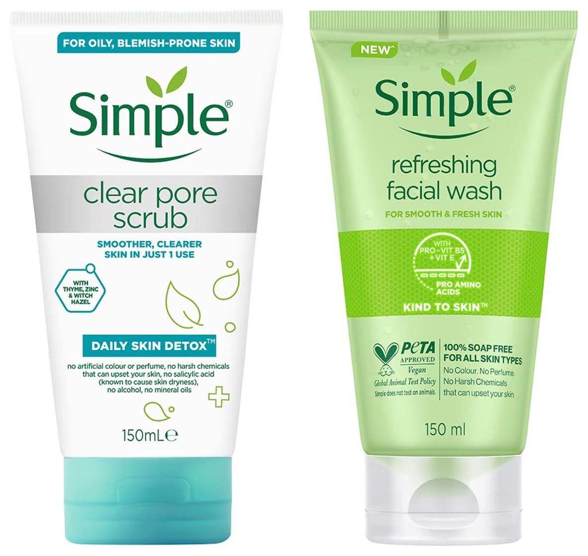 Simple Kind To Skin Refreshing Facial Wash 150 ml Mild Face Wash with No Harsh Chemicals Soap Free Paraben Free Gentle Cleanser for Sensitive SkinHave oily acne prone sensitive skin? Simple Refreshing Facial Wash is just facewash for your oily skin. This mild facewash thoroughly washes away make-up dirt and other impurities leaving your skin feeling clean fresh and revived. This is the best facewash for oily skin as it's known to remove that extra oil but not dry out your skin. In fact it boosts hydration levels and cleanses gently. Made with skin-loving ingredients it contains Triple Purified Water and vitamins to help replenish and nourish your skin without irritation. Its gentle soap-free formula will make sure you don't dry out your skin. It's a gel formulation known to be the best facewash for sensitive skin. Our Refreshing Facial Wash like all Simple products contains no colour or dye no soap and no artificial perfume. We're dermatologically tested and approved and ophthalmologically tested. Specially designed for sensitive skin users we're tested and approved hypoallergenic and non-comedogenic. At Simple we're all about Clean Beauty with 100% efficacy! And it's really SIMPLE â no skin irritants only skin loving ingredients as we know what we leave out of our products is just as important as what we put in! In fact we only include ingredients that downright love your skin and respect its natural balance and build it further. Because all skin can be sensitive at times; pollution stress irritants changing weather lack of sleep and city living there's a million reasons why your skin can feel a little sensitive and need the extra care and kindness. And we believe Clean Beauty is Simple even for sensitive skin! Aqua Cocamidopropyl Betaine Propylene glycol Hydroxypropyl methyl cellulose Panthenol Tocopheryl Acetate Pantolactone Sodium hydroxide Disodium EDTA Sodium Hydroxymethylglycinate Ingredients correct at time of publishing. Always check product packaging.Simple Daily Skin Detox Clear Pore Facial Scrub With Witch Hazel| For Oily Pimple Prone Skin| No Harsh Chemicals| Tested on Sensitive Skin 150 mlRefresh and renew your skin with new Simple Daily Skin Detox Clear Pore Scrub our exfoliating scrub specially designed for oily skin. Blended with thyme zinc and witch hazel this facial scrub cleanses deep down to help eliminate pore-clogging dirt oil and make-up to leave skin purified. While added bamboo exfoliators gently refine pores and rough uneven patches to leave skin clear and smooth. Remember â you get smoother and clearer skin in just 1 use. Simple comes with the expertise in helping your sensitive skin to be at it's best. Simple Daily Skin Detox range specialise in oil and sensitive skin. Try the other products in the range. Our products have No artificial perfume or colour No harsh chemicals that can upset your ski No alcohol No salicylic acid â So yes we are perfect for Sensitive skin! Simple is globally certified as PETA â Cruelty free on our furry friends around. And yes we are kind to planet too our packaging is recyclable. Step 1 Lather a small amount in your hands Step 2 Using light pressure massage onto wet skin Step 3 Rinse thoroughly. Designed to resolve oily skin in the gentlest way we recommend using 2-3 times per week!
