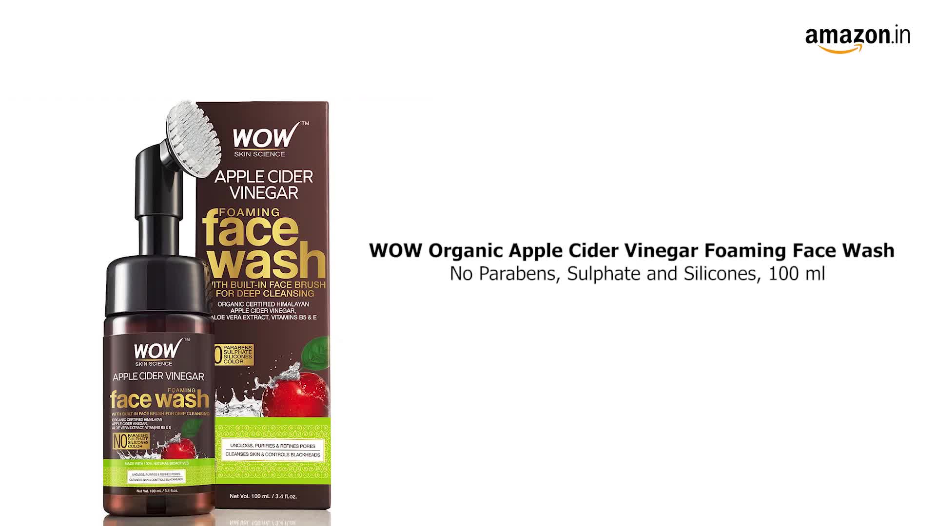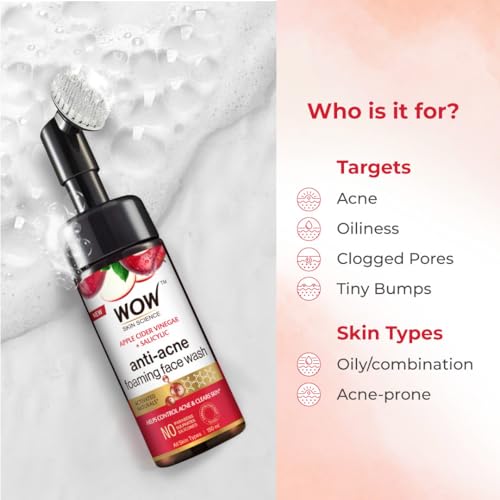 WOW Skin Science Organic Apple Cider Vinegar Face Wash equipped with the foaming face brush is specially formulated to lock your pores with intense cleansing and nourishment. It helps in purifying pores and diffuse the mulish impurities leaves your skin clean clear and radiant with every wash. The packaging includes in-built face brush that is well designed with gentle silicone bristle to give your face deep cleansing on surfaced and within enlarged pores. Helps your skin to fight against acne and blackheads. Gentle cleansing and proactive anti-acne care for your skin with wow skin science apple cider vinegar foaming face wash! It is enriched with pure apple cider vinegar aloe vera extract and vitamins b5 and e for cleansing healing and hydrating care to get you clear soft and supple skin. When massaged on damp skin its rich foam dissolves and washes away the dead skin cells dirt and pollutants from the surface of your skin and all the open pores. Apple cider vinegar contained helps balance the essential skin oils tighten the open pores and lighten blemishes. The aloe vera extract soothes inflammations and gives an intensive hydration to your skin. Vitamin b5 and e can enhance the elasticity of your skin and its ability to retain moisture. All in all your skin will feel so much clearer softer and brighter. Key Ingredients: Purified Water Sodium Cocoyl Isethionate Sodium Lauroyl Sarcosinate Disodium Cocoamphodiacetate Decyl Glucoside Cocamidopropyl Betaine Glycerin (Vegetable Derived) Sodium Lactate Sodium PCA Apple Cider Vinegar Aloe Vera Extract D Panthenol (Pro-Vitamin B5) Tocopheryl Acetate (Vitamin E) Allantoin Sodium Benzoate Potassium Sorbate Phenoxyethanol & Fragrance. HOW TO USE Splash some water on the face and neck. Pump out a little amount of the face wash apply all over your face and neck. Use the built-in brush in a circular motion on your face and neck to remove dirt. Move from the base of your neck to the jawline and then upwards to the cheeks nose and forehead. Massage for 2 minutes and then rinse thoroughly with plain water. Use the face wash at night to keep your skin clear of dirt and pollution. Follow with a moisturizer.