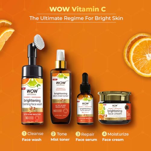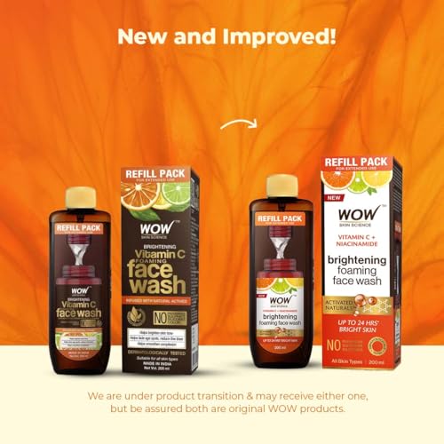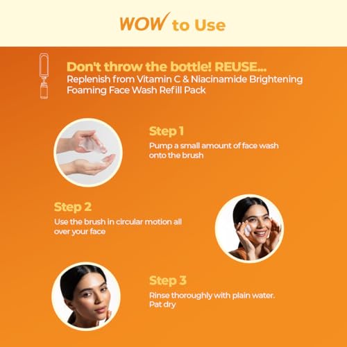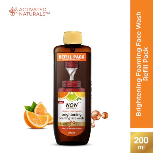 Never worry about running out of your favourite WOW Skin Science brightening vitamin c foaming face wash with the refill pack. Extend your skin care routine and fill up your existing foaming face wash bottle from this pack. This lets you have great skin while being more responsible towards planet earth. You are able to reduce your carbon footprint because 30% of the material of this bottle is PCR (post consumer recycled) which helps us to make recycling easier and reduce the impact on landfill and garbage disposal system. Go on continue to keep your skin feeling refreshed and radiant with brightening vitamin c foaming face wash. It is a skin-reviving face wash that helps to refresh dull skin by gently removing layer of dead skin and keeping excess sebum in check. It is infused with active vitamin c orange and lemon essential oils liquorice and mulberry extracts that help to improve your skins texture and appearance. Vitamin c helps neutralize skin damaging fre radicals responsible for dullness age spots and wrinkles. Lemon and orange essential oils help even out complexion and restore skins radiance. Liquorice and mulberry extracts are proven melanin blockers that keep excess melanin production in check which helps to diminish spots and reduce uneven patchy complexion. Hyaluronic acid in the face wash is a natural moisturizer helps to keep the skin soft supple and hydrated as it supports skins collagen structure. It helps to give your tired dull complexion a radiance boost. Use the face wash twice a day to keep your skin clear of dirt and pollution. Its tangy citrusy fragrance revives your senses.