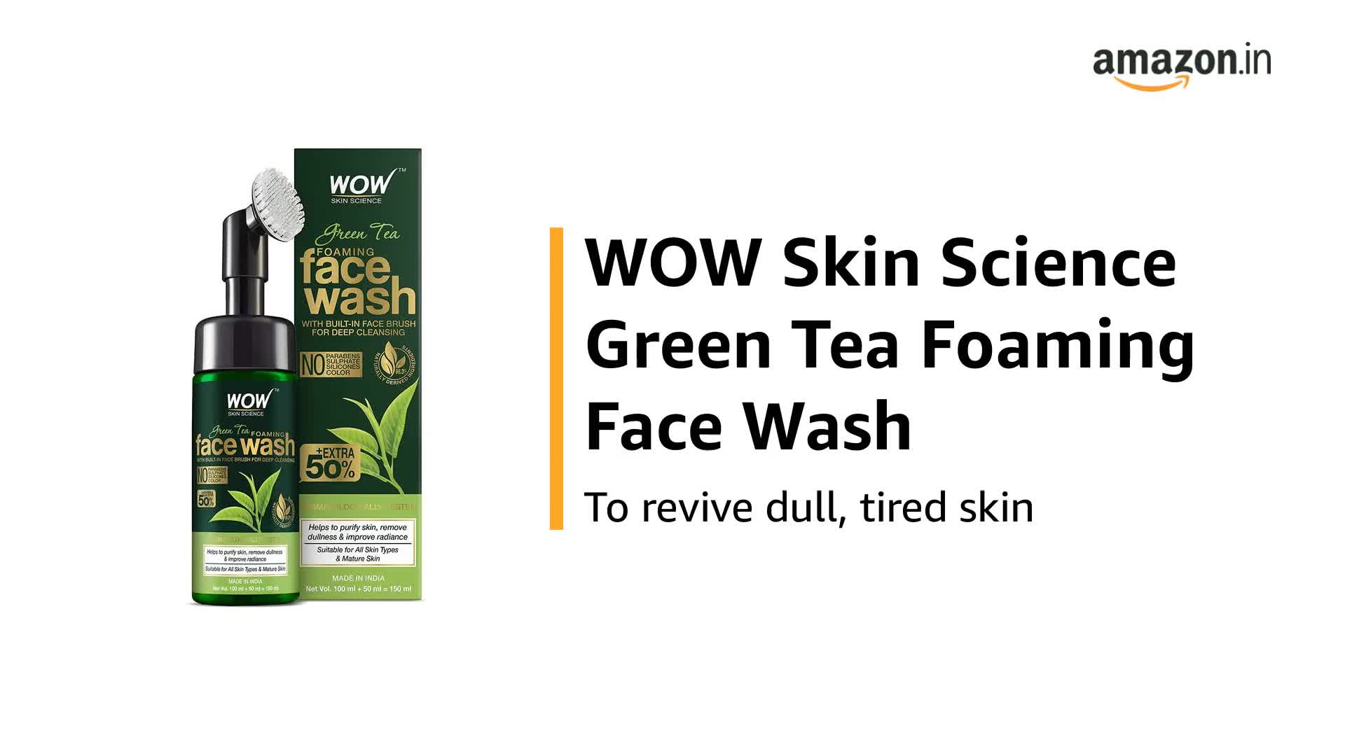Help revive dull tired skin with WOW Skin Science green tea foaming face wash with built in face brush. Delivers the goodness of green tea extract aloe vera extract pro-vitamin B5 and vitamin e. The face wash packed with skin-protecting antioxidants supports in fighting signs of aging like fine lines age spots and dryness. It washes away dirt and pollutants without drying your skin. It leaves the skin hydrated and soft as the actives help to replenish lost moisture to your skin. The face wash also helps to balance skin and give you more even-toned complexion. This face was suits every skin type and is ideal for those with aging tired skin. The built-in face brush with soft silicone bristles helps to gently exfoliate skin and give it a thorough cleansing and add radiance and suppleness to your skin. The face wash is infused with antioxidant rich green tea extract which is loaded with vitamin B12. It helps to neutralize skin-damaging free radicals and restore skin health. Aloe vera extract in the face wash is a natural skin hydrator that replenishes dry skin and helps to restore skins natural moisture barriers. Pro-vitamin B5 an essential nutrient that supports skin repair and renewal; and vitamin e a skin repairing moisturizer that strengthens the lipid structure and moisturizes skin. It helps to add glow and suppleness to your skin. Use this face wash daily to get fresh dewy soft and healthily bright skin.