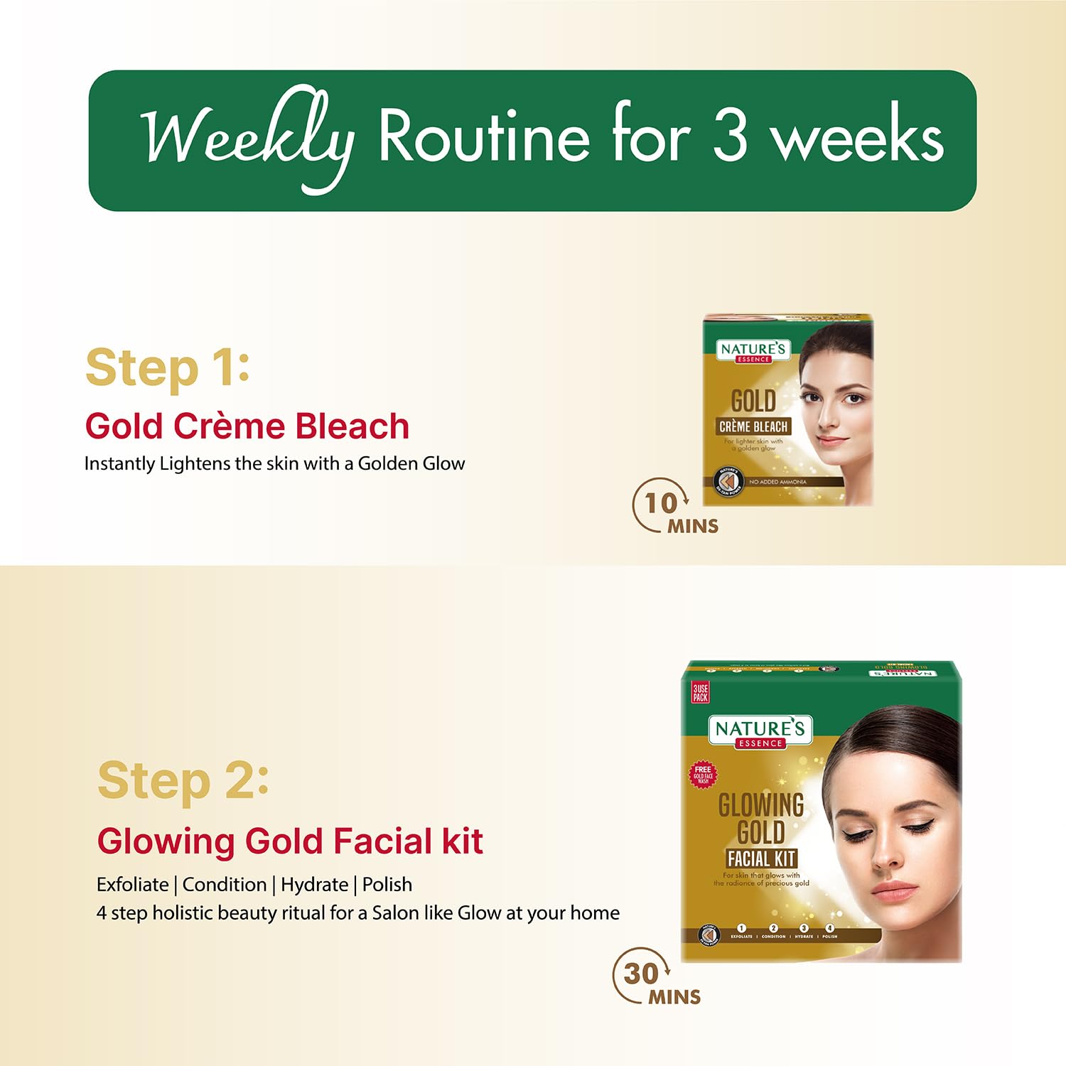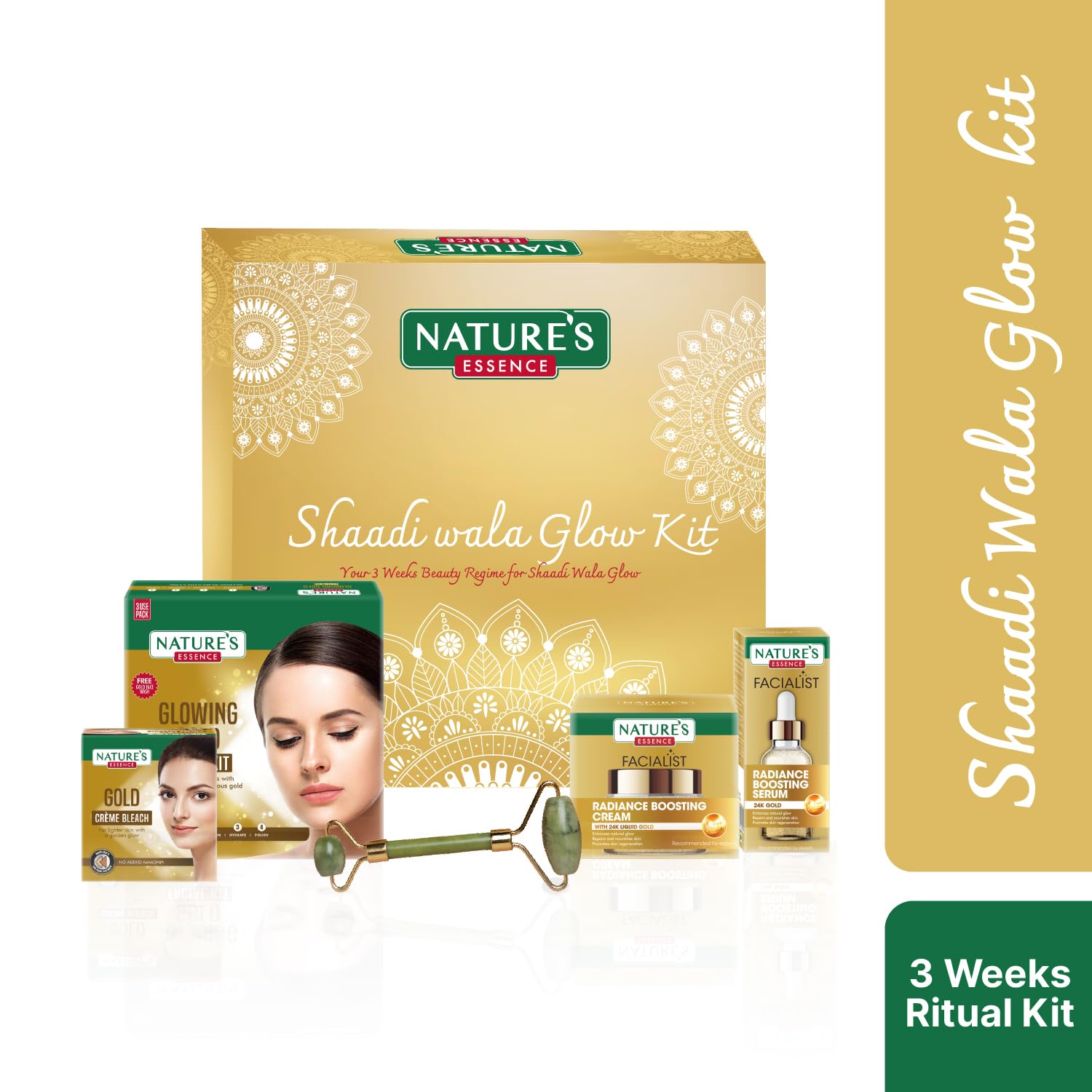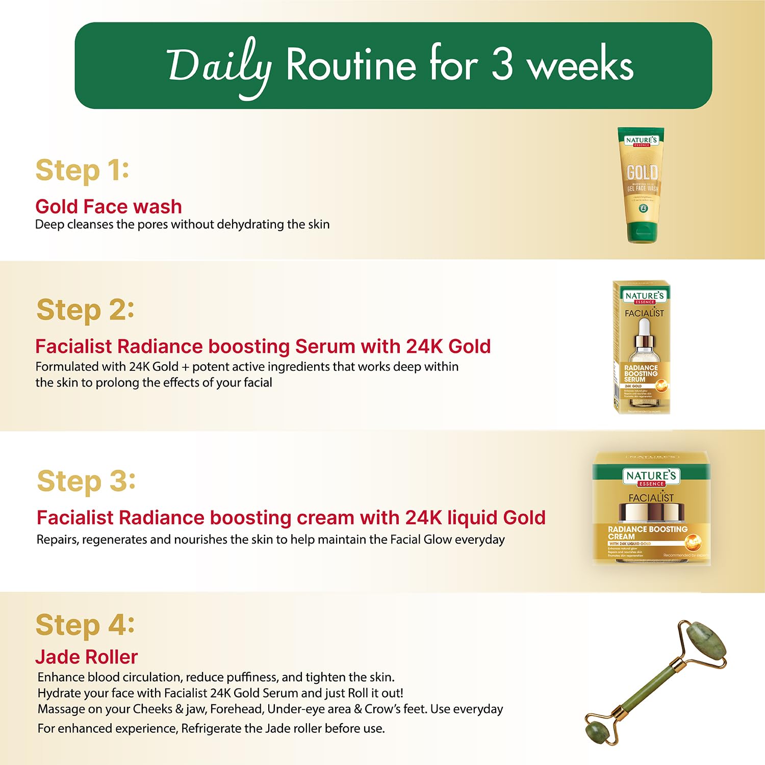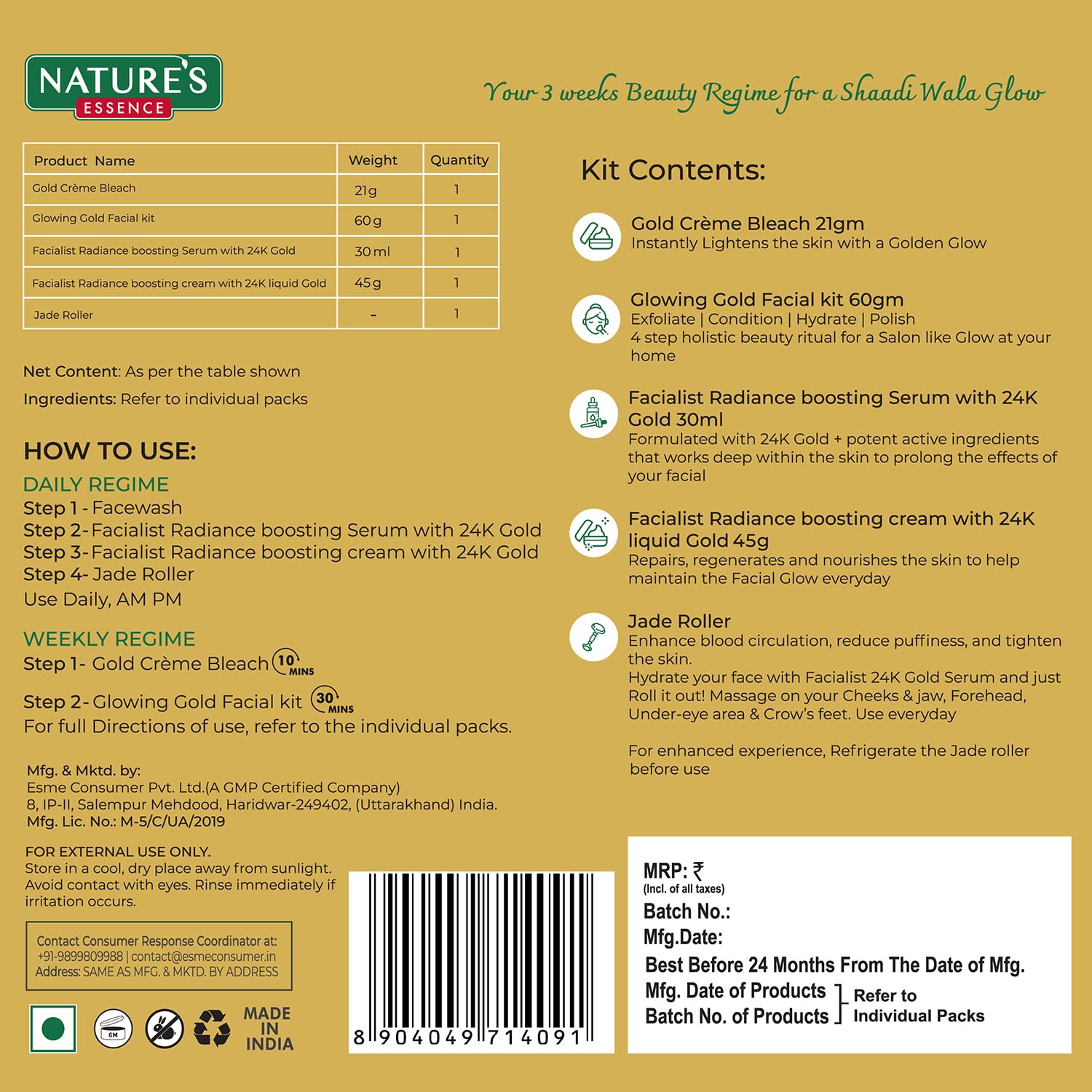 Your 3 weeks Beauty Regime for a Shaadi wala glow. DAILY RITUAL 1. Gold gel Face Wash 50ml 2. Facialist Radiance boosting Serum with 24K Gold 30ml 3. Facialist Radiance boosting cream with 24K liquid Gold 45g 4. Jade Roller Use Daily AM PM WEEKLY RITUAL 1. Gold Crème Bleach 21g 3 Use pack 2. Glowing Gold Facial kit 60g - 3 Use pack KIT CONTENTS ⢠Gold Crème Bleach 21gm Instantly Lightens the skin with a Golden Glow ⢠Glowing Gold Facial kit 60gm Exfoliate | Condition | Hydrate | Polish 4 step holistic beauty ritual for a Salon like Glow at your home ⢠Gold Face wash 50ml Deep cleanses the pores without dehydrating the skin ⢠Facialist Radiance boosting Serum with 24K Gold 30ml Formulated with 24K Gold + potent active ingredients that works deep within the skin to prolong the effects of your facial ⢠Facialist Radiance boosting cream with 24K liquid Gold 45g Repairs regenerates and nourishes the skin to help maintain the Facial Glow everyday ⢠Jade Roller Enhance blood circulation reduce puffiness and tighten the skin. Hydrate your face with Facialist 24K Gold Serum and just Roll it out! Massage on your Cheeks & jaw Forehead Under-eye area & Crows feet. Use everyday