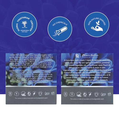 100 percent free of petrochemicals phthalates toxic ingredients artificial fragrance and colour. A luxurious night cream repair and replenish by working my magic on your skin while you sleep. My anti ageing formulation powered with natural vegetable oils of sunflower seed peach and wheat germ rich in vitamin e helps in skin regeneration. The blend of essential oils of patchouli and geranium along with the extracts of carrot lotus and olive leaves helps to fade blemishes rebalances the oil and water concentrations in the skin enriching it with minerals amino acids and antioxidants so you wake up to radiant healthy skin. Am also an excellent massage cream.