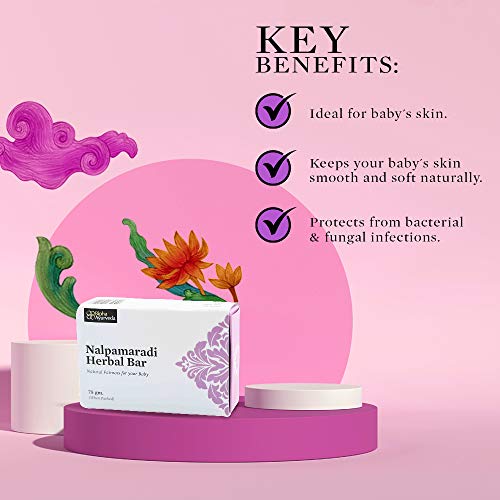 Nalpamaradi herbal bar is enriched with bark extracts of four ficus species. It provides natural fairness for the skin of babies. The soap is ideal as it keeps the skin smooth and soft while protecting it from fungal infections.