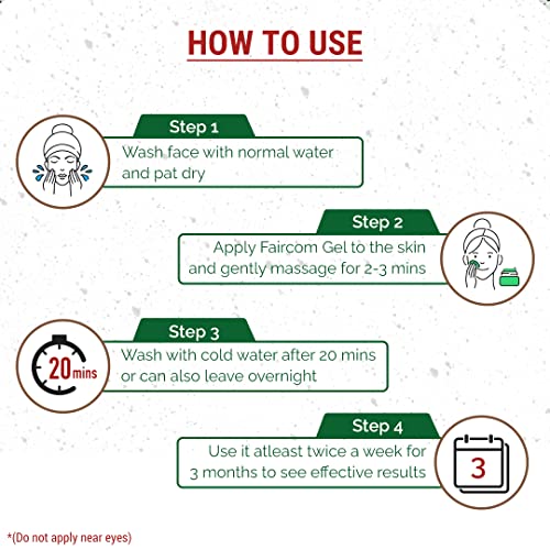 "Wash face with normal water and pat dry. Apply to the skin and gently massage for 2-3 mins. Do not apply near the eyes. Wash with cold water after 20 mins. Use it at least twice a week for 3 months to see effective results. Can also apply and leave overnight. BENEFITS - Clears Dead Skin Cells Improves Complexion Treats Dark Spots Removes Skin Tan Combats Hyperpigmentation Of Skin Maintains Youthfulness Removes Toxin DESCRIPTION - Dr. Jain's Herbal Products is one of the well-recognized manufacturers of Herbal Health Skin & Hair Care Ayurvedic Powders Gels & Aromatic Essential Oils. As per the demands a well-researched formulation based on pure herbal and superior quality Ayurvedic products. Faircom Fairness Gel is a 100% Natural Fairness treatment that effectively stops Hyperpigmentation throughout the body irrespective of the skin type and age- group. It adds soft smooth and natural radiance to the face. It effectively treats dark spots and dark circles."