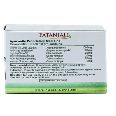 Patanjali Aloevera moisturizing cream is the best natural moisturizer. It is a natural face cleansers that provide you smooth and beautiful skin. This is made up of natural herbs that rejuvenates your skin and gives you a smooth and young looking skin. It helps in balancing the pH levels and water content of your skin. It provides moisture to your skin and removes dryness from your skin in a natural way. It is a wonderful moisturizer for your skin that helps you to get rid of dryness. It is also useful to fight against the cracks in the skin that may occur due to loss of moisture content from the skin cells. It makes your skin smooth to touch if you apply it regularly. It produces no harmful effects on your skin even if you apply it every day. It is the best solution for dry and cracked skin that may occur during winters due to loss of moisture from the skin. There are a large number of products in the market for skin care. It is very difficult to choose the right skin care product. One should rely on herbal products to take proper care of the skin.Benefits of Patanjali Aloe Vera cream* Patanjali Aloe Vera moisturizing cream is the best natural moisturizer for your skin. It consists of natural face cleansers and herbs that provide you with a smooth skin.* The most important benefit of this moisturizing cream is that it helps in maintaining the balance of pH in your skin and helps you to get back the normal looking skin.* It helps to prevent wrinkles and other signs of ageing by supplying the proper nutrients to your skin.* It rejuvenates the skin cells and brings a natural shine and glow on your face. You can apply this moisturizing cream everyday to get smooth and natural looking skin.* It consists of natural extracts of Aloe Vera that is a wonderful herb for your skin. Aloe Vera has natural anti-oxidants that remove the dead cells from your skin and gives a fine tone to your skin.* It is packed with other natural ingredients that keeps your skin well hydrated and prevents dryness of the skin without producing any harsh side effects. It produces no allergic symptoms such as itching, redness and burning of the skin. This is a suitable moisturizer for all skin typesPrevents ageing & dehydration of skin, protects skin against winter dryness & roughness, makes skin soft, smooth & beautiful .Shea butter, coconut oil, wheat germ oil, olive oil, aloevera