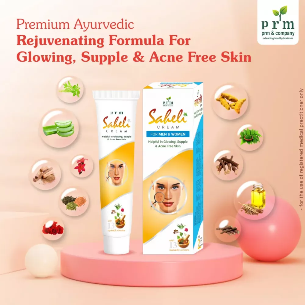 Saheli face cream is a special ayurvedic formulation filled with years of ayurvedic wisdom that has been developed by PRM & COMPANY to give glowing, supple and acne free skin. Saheli cream made with 13 ancient herbs like Aloes, Wheatgerm Oil, Neem, Turmeric, Chandan, Tulsi, Gulabdal and many more