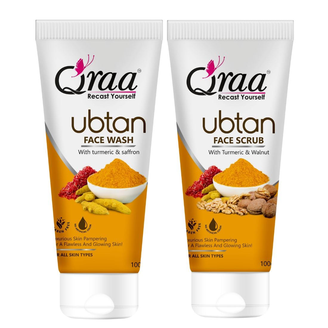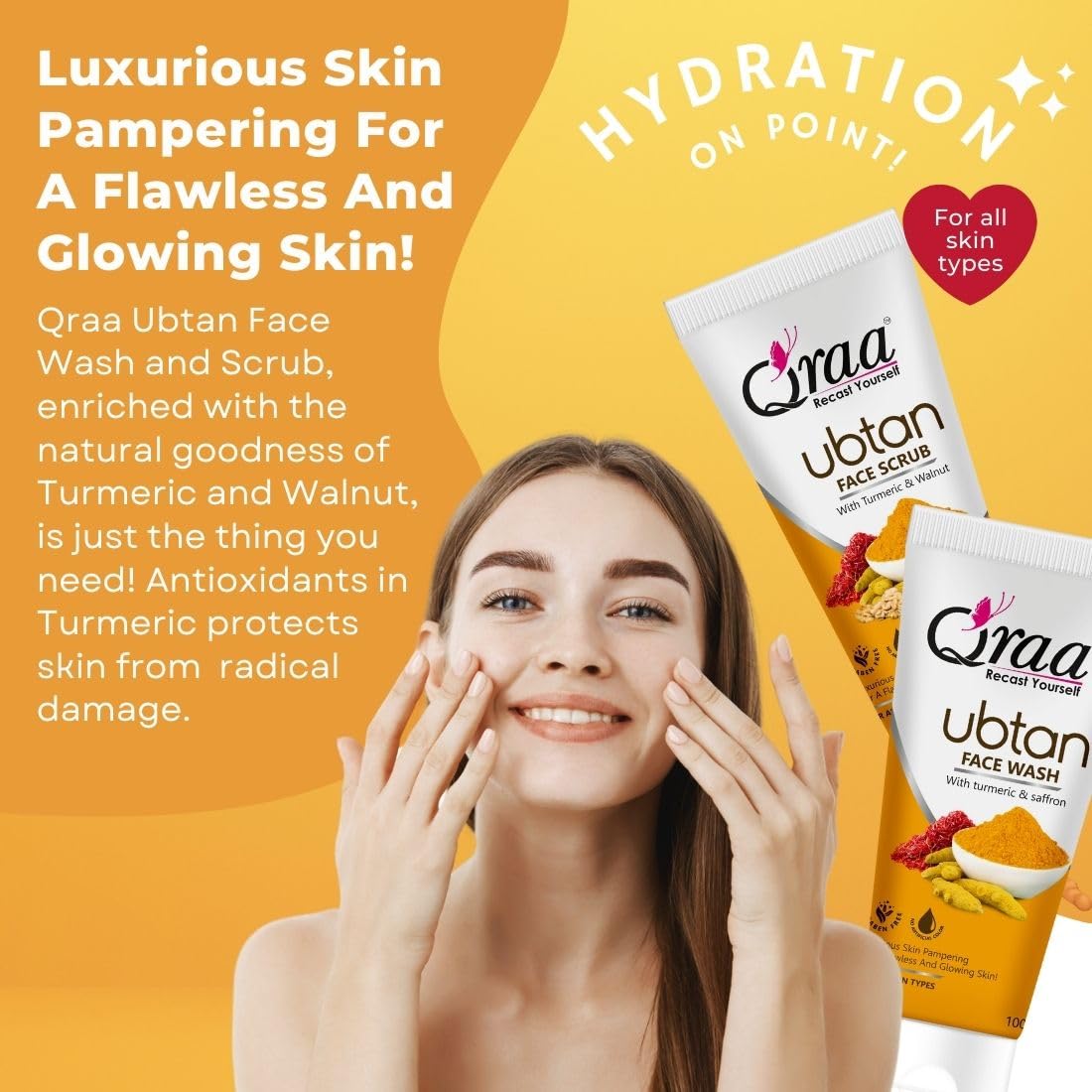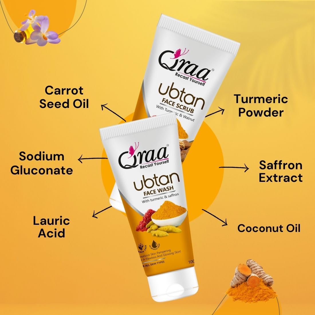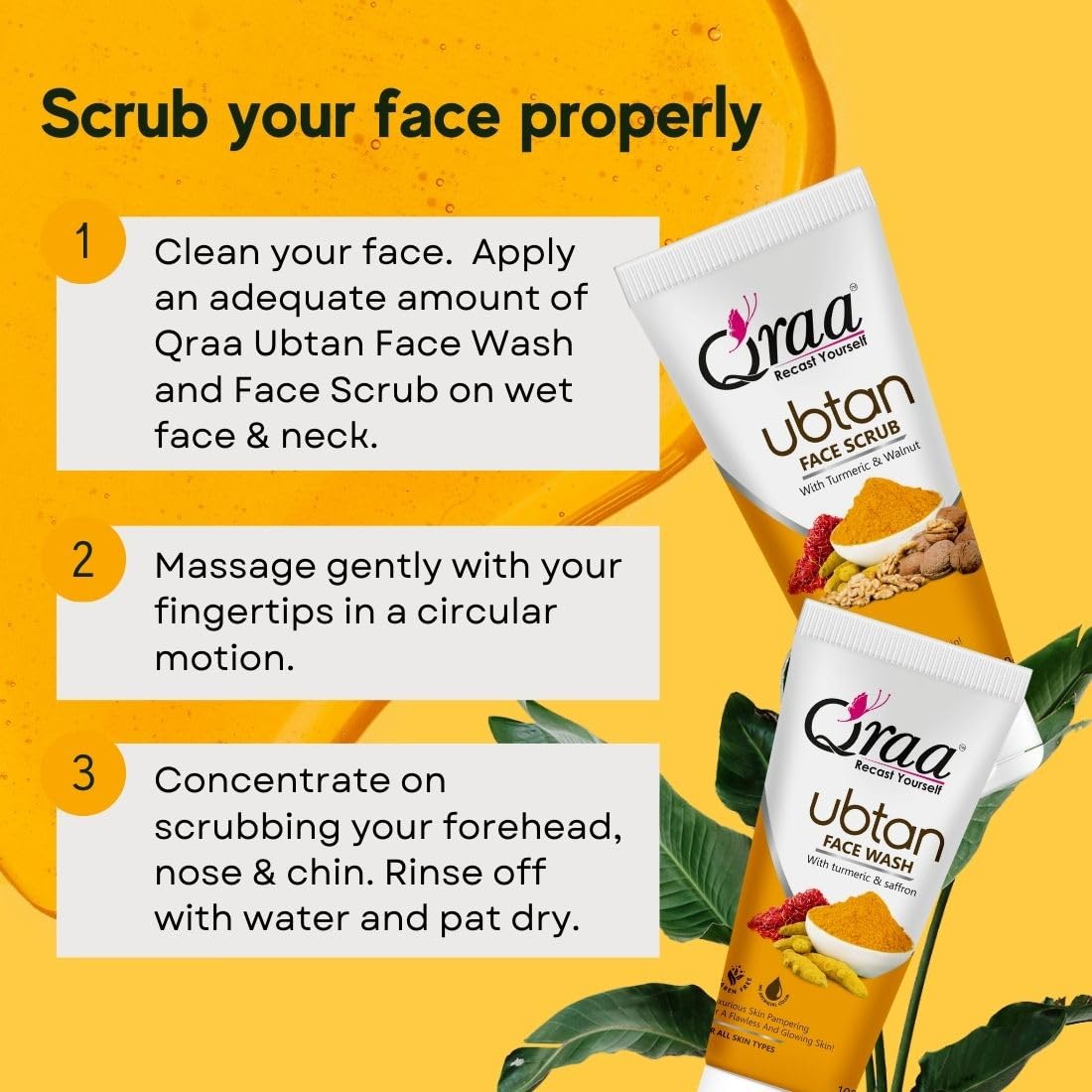 Qraa Ubtan Face Wash and Ubtan Face Scrub For All Skin Type With Turmeric & Saffron For Tan Removal Skin Lightening Glow & Radiance | combo pack - 100g*2
