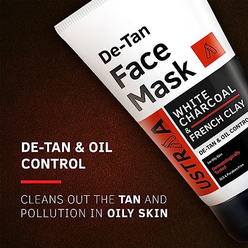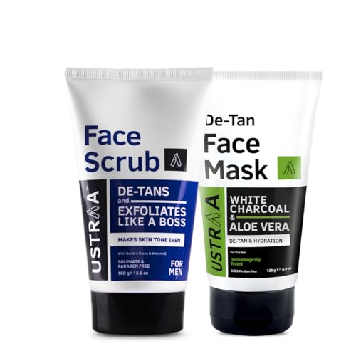 Ustraa De-tan Face Scrub - For men who spend a lot of time outdoor or sweat it out at the gym this is a must. While a face wash cleans your face the scrub penetrates into the pores of your skin and removes the dead skin. Making the skin healthier. Pollution stress lifestyle that involves eating a lot of junk food smoking or staying up late affects your facial skin health. This ultimately leads to pimples white-heads black heads uneven colour tone and dryness. The Ustraa face scrub helps repair your skin from all that and also de-tanning. With bigger walnut granule sizes it works more efficiently on a man's face as we men have thicker skin. Ustraa Face Mask - Dry Skin - This is a face mask designed to remove tanning and even out the skin tone. Skin that gets affected by prolonged sun exposure pollution and other irritants tends to gather impurities from the atmosphere which in the long run effect skin and enhance aging and appearance. This mask helps to remove those impurities from the face and keep the face looking fairer younger and healthier. It also restores moisture and keeps skin healthy. It is not a peel-off mask so it needs to can be washed away with water easily.