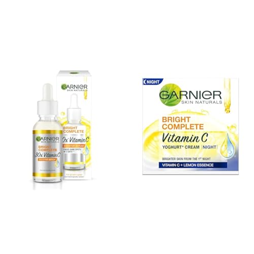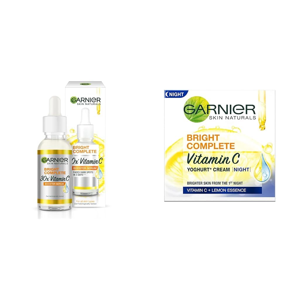 Garnier Skin Naturals Face Serum Brightening and Anti-Dark Spots Bright Complete Vitamin C Booster 50 mlBright Complete Vitamin C Booster Face Serum is Garnier's most concentrated brightening formula yet. Compared to our day cream this serum is enriched with 30 times the amount of Vitamin C! Together with the lemon extract this lightweight non-oily formula penetrates the skin to instantly increase its glow as well as reduce dark spots in 3 days* - all in a safe and natural way! (* According to clinical tests)Garnier Skin Naturals Night Cream Anti-Dark Spots & Brightening Bright Complete Vitamin C Yoghurt 40 gHelp your skin stay well-nourished all night with Garnier's Bright Complete Vitamin C Yoghurt Night Cream. This lightweight formula is quickly absorbed into the skin the ad leaves the skin feeling non-sticky without giving it any greasy finish. After the first application your skin gets a noticeably brighter glow with dark spots being less apparent. The night cream is enriched with natural ingredients such as Vitamin C lemon essence and yogurt Bifidus which helps reduce dark spots and brightens your skin