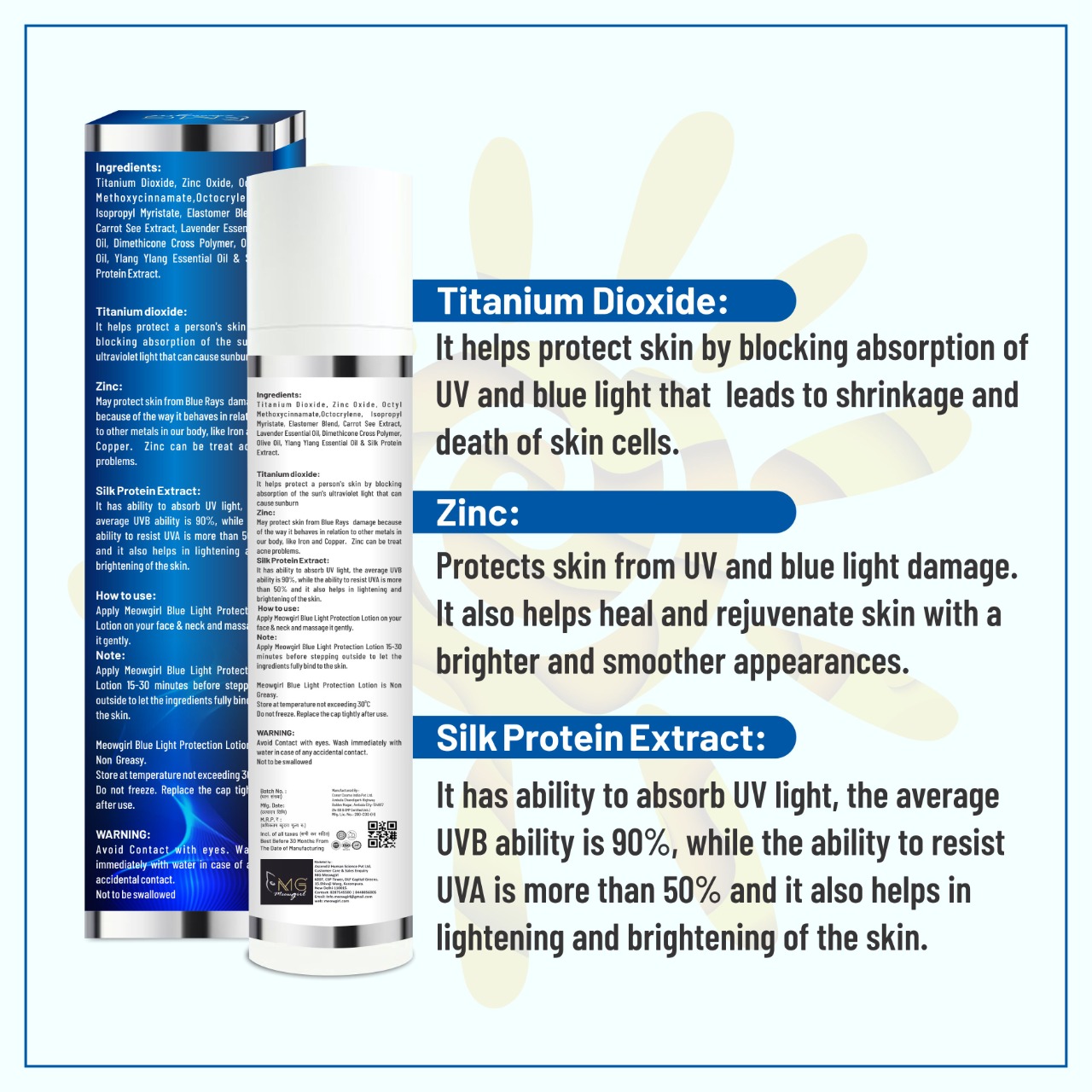 MGmeowgirl Advanced Blue Light Protection: This lotion is designed to protect the skin from the harmful effects of blue light emitted by electronic devices such as smartphones, computers, and LED screens. It forms a protective barrier on the skin's surface, preventing blue light penetration and lowering the of skin damage.
