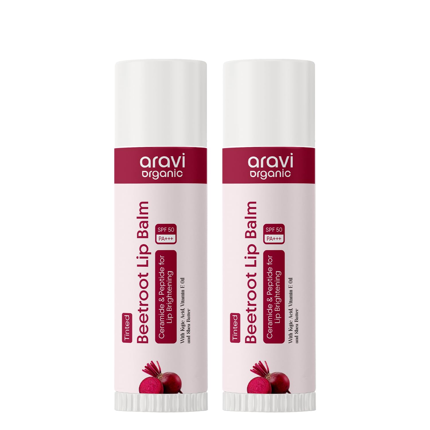 Aravi Organic Beetroot Tinted Lip Balm SPF 50 PA+++ | For Dark & Pigmented Lips | Hydrates Dry & Chapped Lips | Enriched with Kojic Acid Ceramide Peptide & Vitamin E | Soft Glossy Lips for Men & Women Pack Of 2