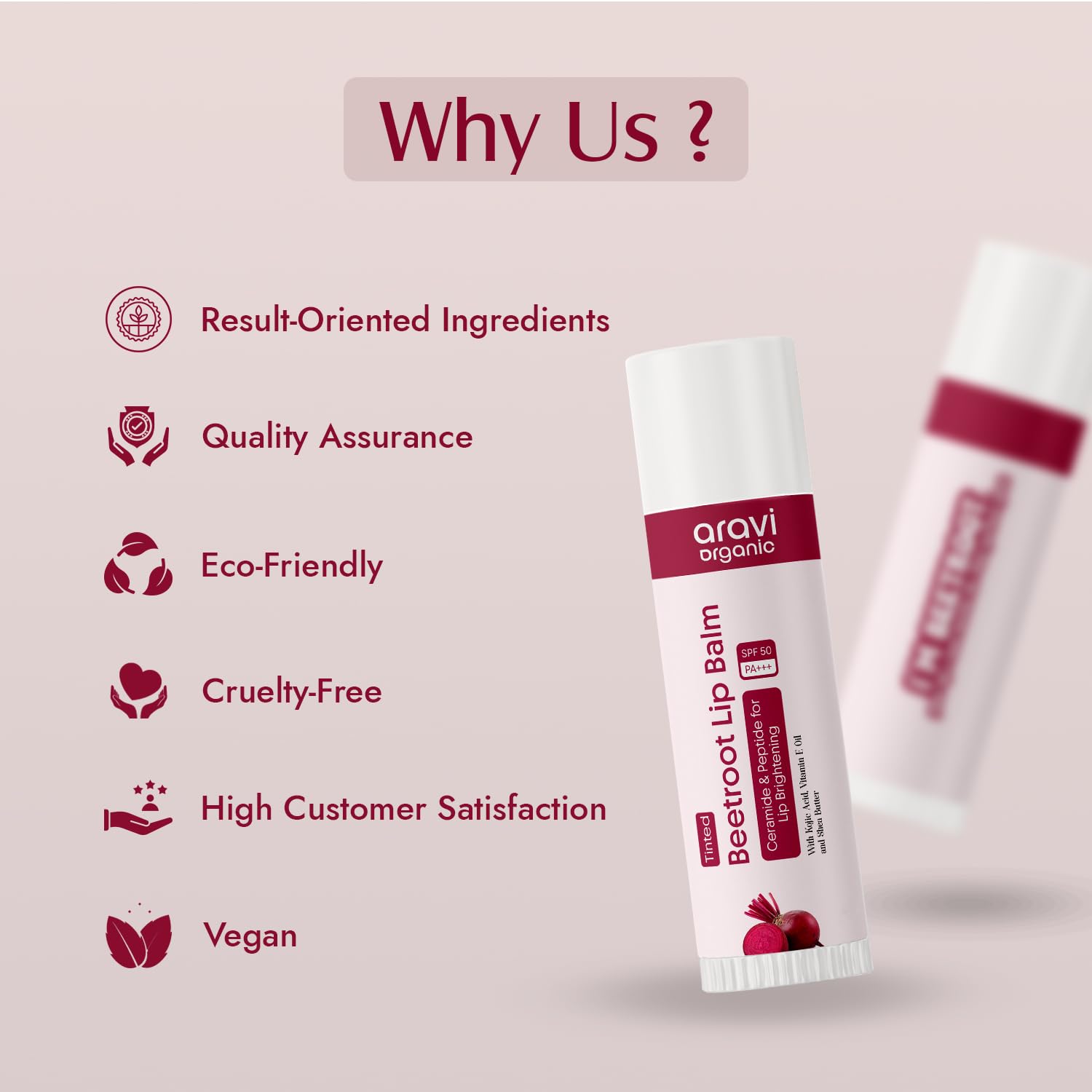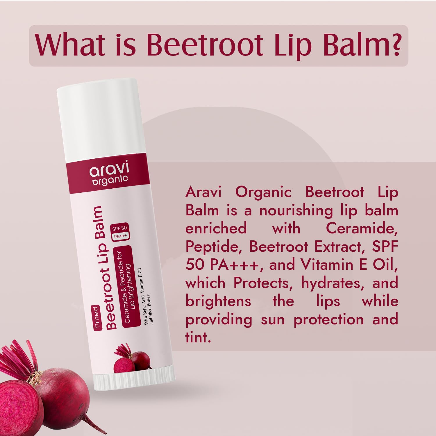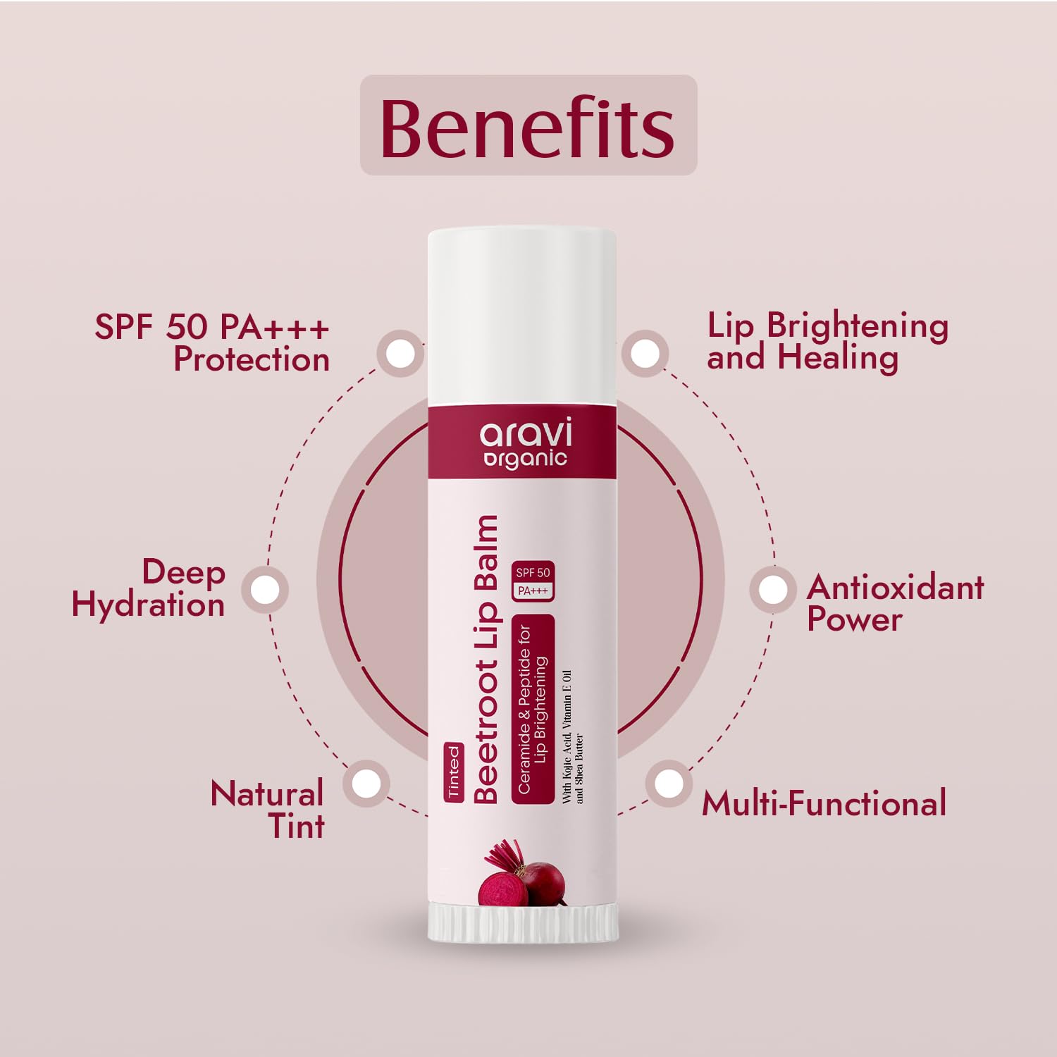 Aravi Organic Beetroot Tinted Lip Balm With SPF 50 PA+++ & Kojic Acid - Ceramide & Peptide - Lip Brightening & Hydrating - SLS & Paraben Free 5 gm