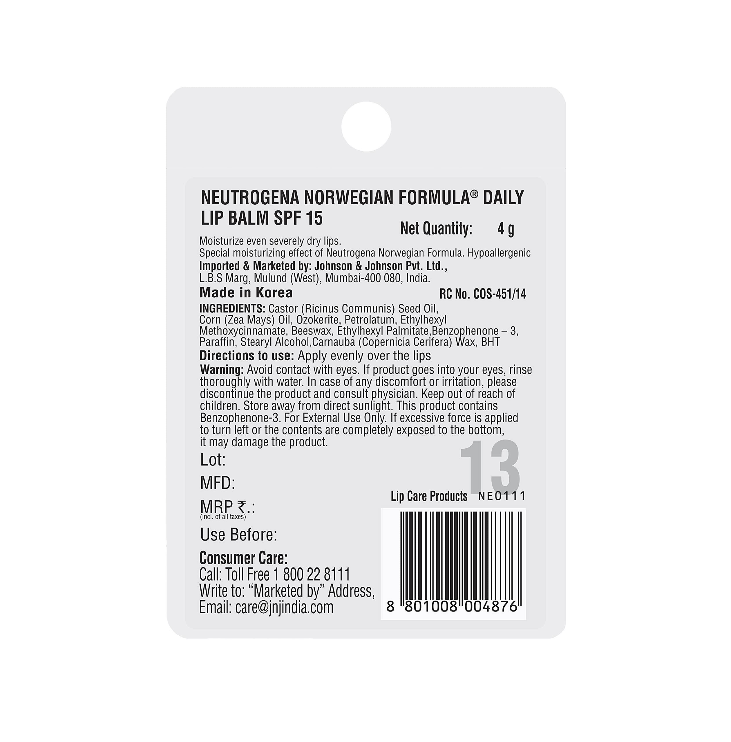 Neutrogena Norwegian Formula Lip Moisturizer SPF15 softens smoothes and protects dry chapped lips with no waxy feel. This moisture-enriched formula soothes and conditions your lips keeg them healthy looking and soft in all weather. This lip balm suitable for women and men contains a PABA-free SPF 15 sunblock for ed protection from the sun. Leaves lips soft smooth and moisturised. Apply on your lips as needed. Can be worn alone or with lipstick. The Neutrogena Norwegian Formula Lip Moisturizer SPF 15 is a good lip protection balm. It s the lip skin and keeps it healthy and soft. It prevents the lips from drying up which further prevents cracked and chapped lips. The lip balm conditions the lips and keeps them protected and soft all year round in all weather conditions and seasons. The product has been developed in consultation with dermatologists. It has an SPF of 15 which provides protection from the UV rays of the sun. Its skin enriching formula helps the dry chapped skin to give way to healthy soft skin. It is PABA-free. It does not have any colour fragrance or unnecessary itives. It is formulated with the highest quality ingredients like octinoxate oxybenzone seed oil corn oil castor ozokerite petrolatum beeswax BHT stearyl alcohol ethylhexyl palmitate and carnauba wax. The product is a translucent natural colour and can be applied over lipsticks to show the lipstick's colour. It comes in a plastic twist container and weighs 4 grams. The cap is airtight that helps the product remain leak-free. It is easy to carry in handbags and small purses for use throughout the day. The Neutrogena Norwegian Formula Lip Moisturizer SPF 15 should be applied 15 minutes before exposure to the sun. It needs to be applied liberally to cover the entire lip area. It should be replenished every 2 hours during prolonged exposure to sunny or dry conditions. Within days of continuous use of the product a visible change can be seen to the texture of the skin and the lips feel soft and healthy. Product Features The product is enriched with SPF 15 for sun protection. It has high-quality ingredients that help the lips. It helps is doing away with dry and chapped skin in all weather conditions. It comes in 4g package and can be used by men and women. The dimensions of the package are 11.4 cm x 8.3 cm x 1.5 cm.