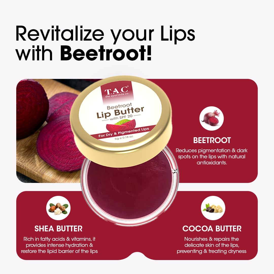 Incredibly rich and Hydrating Beetroot Lip Butter enriched with plant-based essential oils and butter with the goodness of Ayurvedic and Shea Butter is purely designed to replenish and soften dry chapped lips making them look naturally plumped. It's free from synthetic chemicals and petroleum products. Beetroot Lip Butter s a lush of color to the lips.
