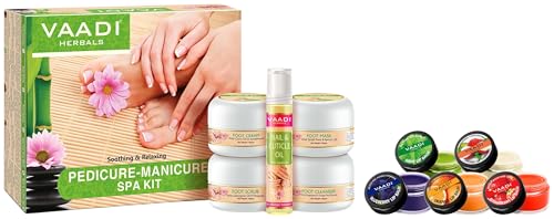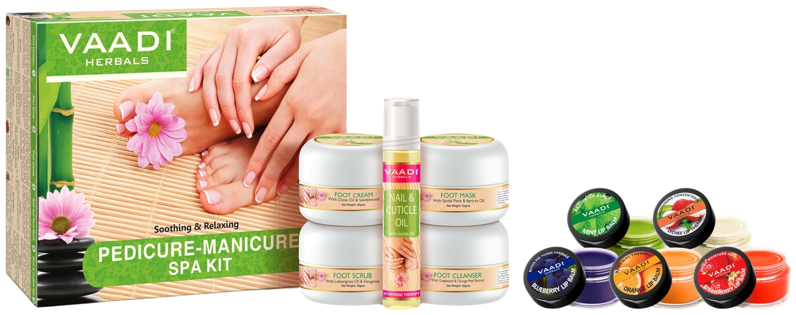 VAADI HERBALS Soothing and Refreshing Pedicure Manicure Spa Kit, Cream and Oil Set, 135g & Assorted Lip Balms, 10g (Pack of 5) 100% Natural Lip Balms| For Dry & Chapped Lips | 24hr Hydration |