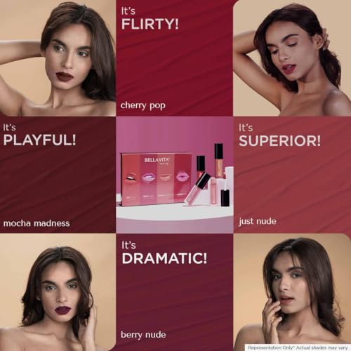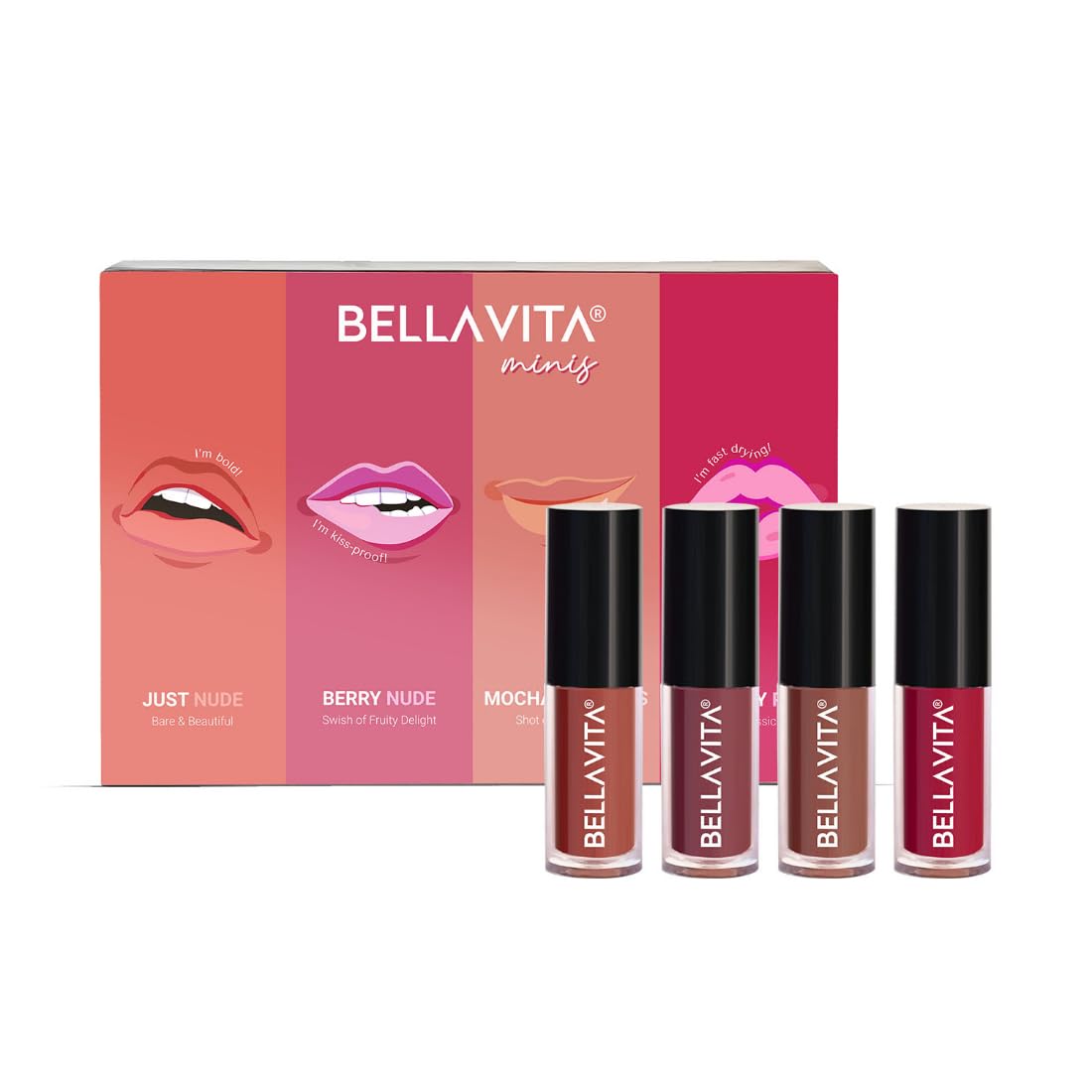 BELLAVITA Mini Kiss Proof Liquid Lipstick Gift Set of 4 x 2ml | Smudge & Transfer-Proof | Intense Moisturisation | Just Nude + Berry Nude + Mocha Madness + Cherry Pop | Lipstick Combo Set | Mother's Day Gift