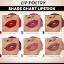 A fabulous range of long-lasting creamy matt lipsticks enriched with Vitamin E & Castor Oil. Lip Poetry is available in 6 stunning shades. This rich and creamy formula offers a non-drying & uncrackable finish that stays comfortably on your lips for up to 8 hrs and is sure to keep your lips soft and hydrated.HOW TO APPLYStep 1: Once your base is ready apply FLiCKA Greet and Treat Lip N Eye Primer to create a smooth texture on your lips. Step2: Use your favourite Tomato Lipstick shade to trace the outline of your lips. Step 3: Fill in your lips with our intensely pigmented lipstickKEY FEATURESAvailable in 6 intensive shades & Sulfate FreeEnriched with Vitamin E & Castor Oil Rich Creamy Matte Formula offers comfortable wearLong Lasting for up to 6hrsIntensely Pigmented. HIGHLIGHTS: Vegetarian Dermatologically tested, Cruelty-free Economical.